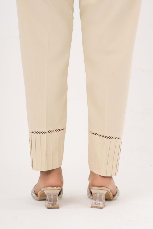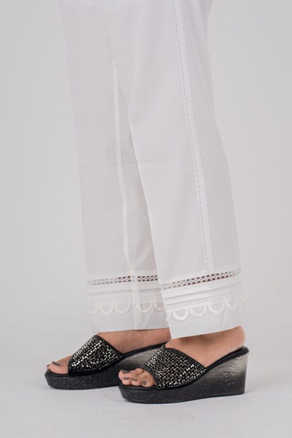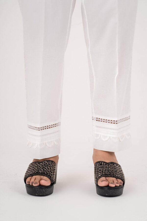 The Daja white pants offer a fresh, classic style. With delicate details at the bottom, these pants are perfect for adding a clean, elegant touch to any outfit.