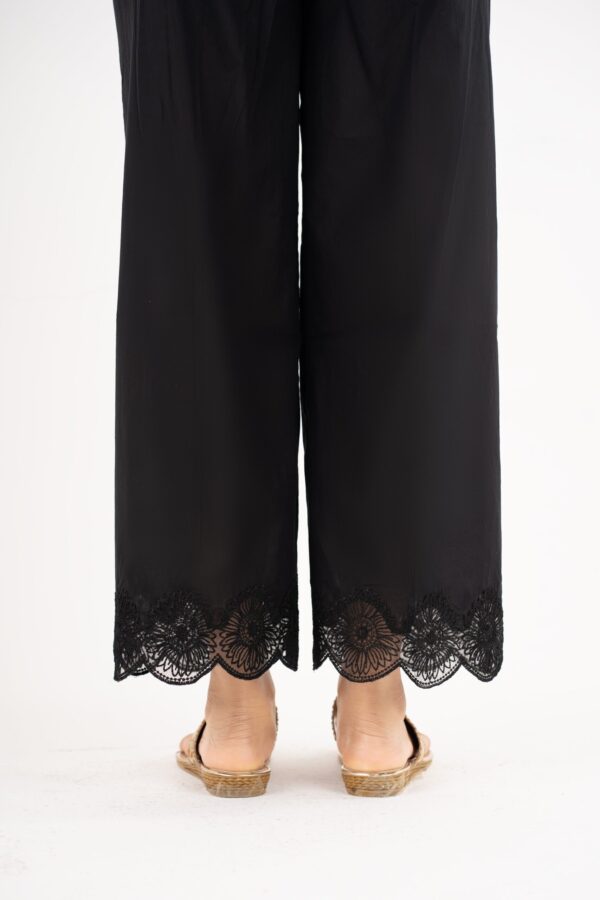The Nahida pants are designed to add subtle elegance to your wardrobe. The black fabric with lace detailing at the bottom makes these pants a versatile addition to your separates collection.