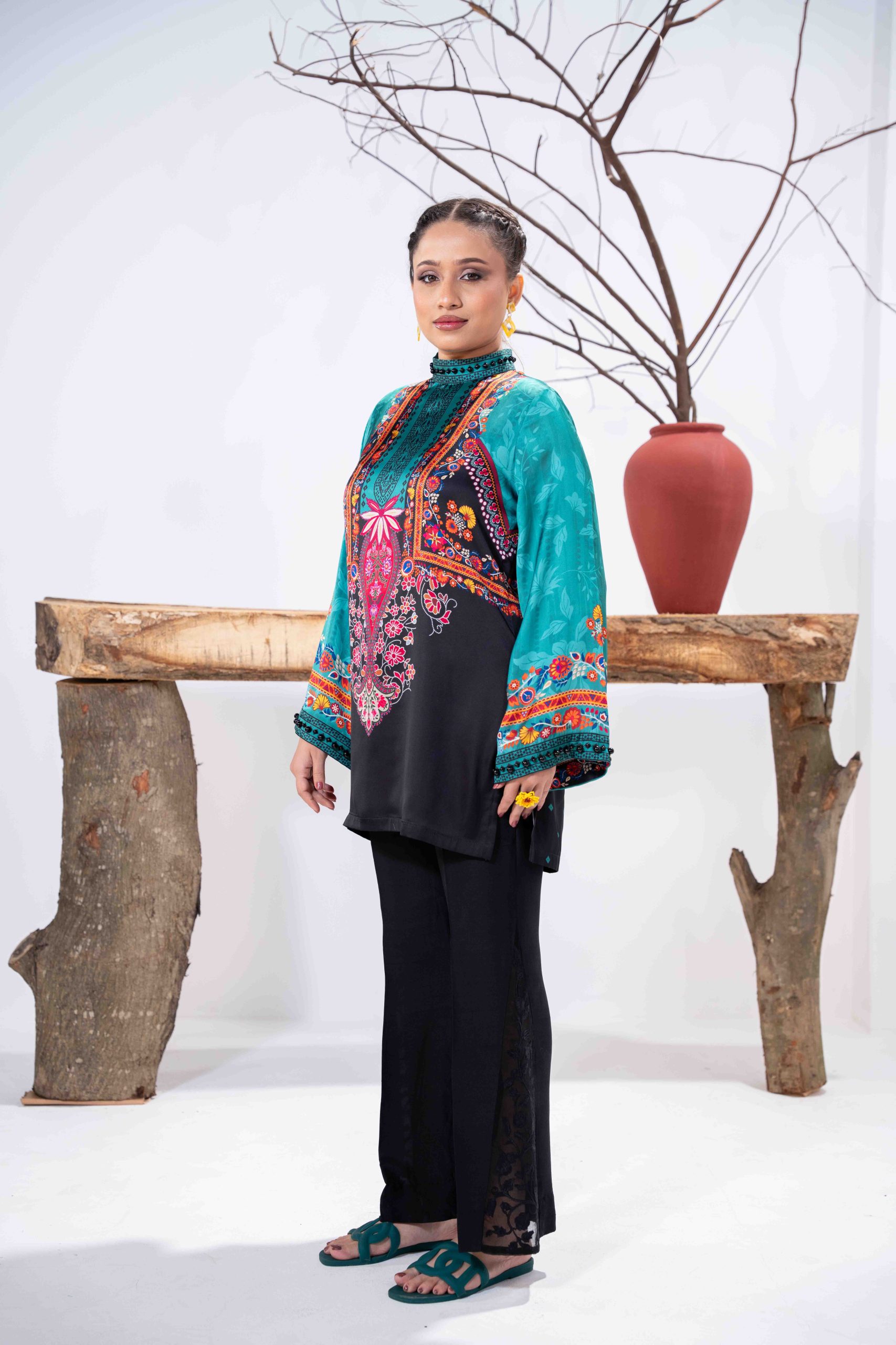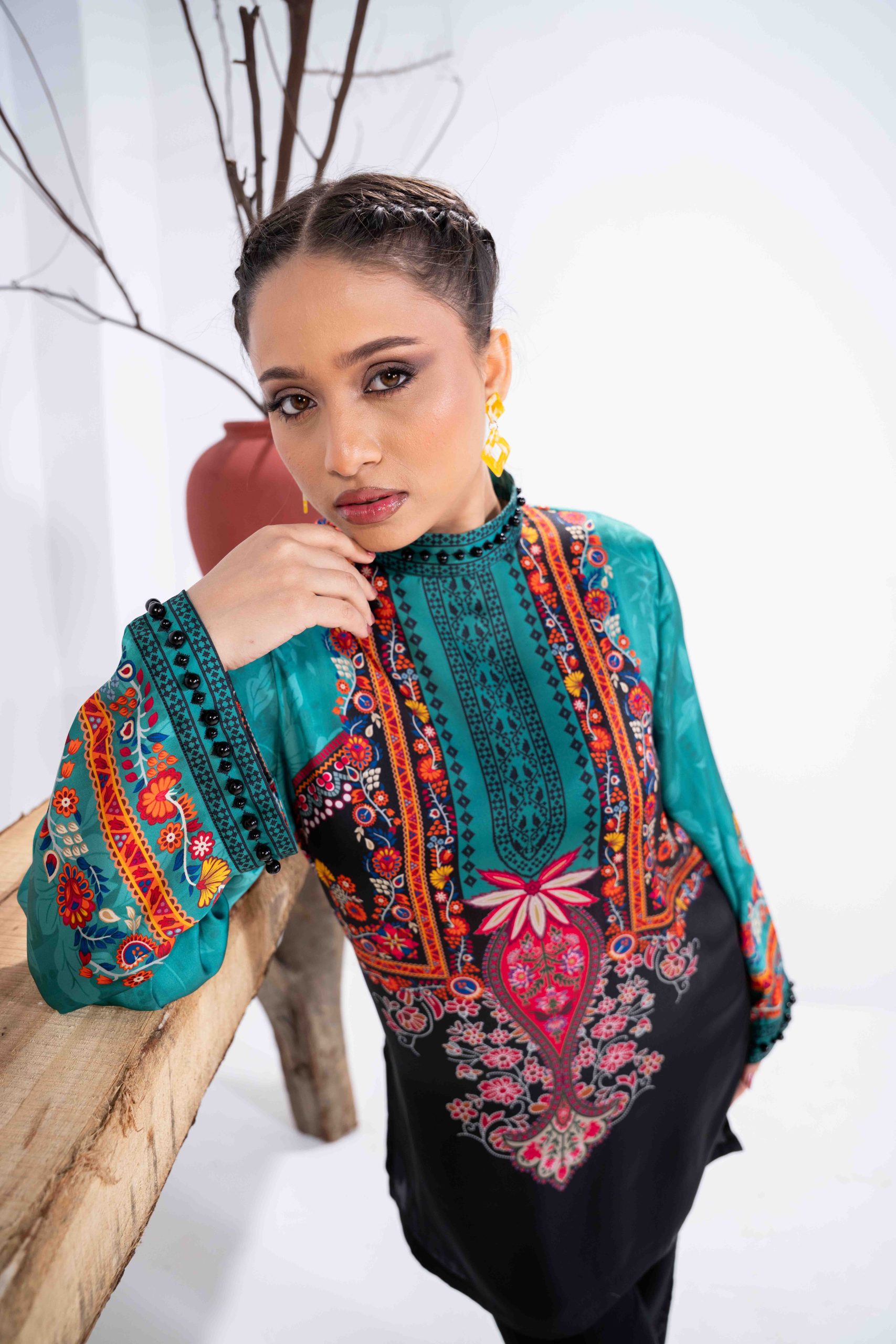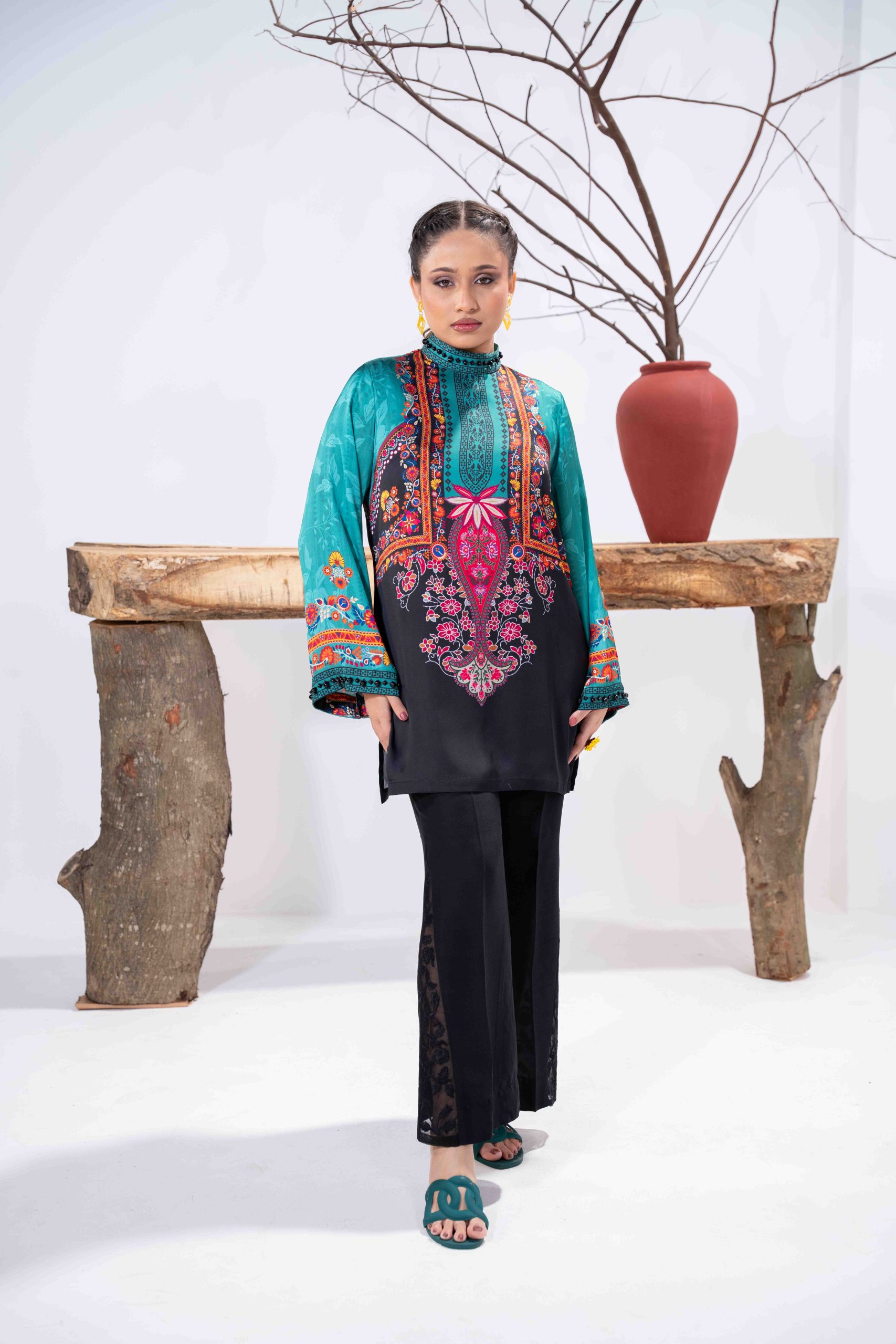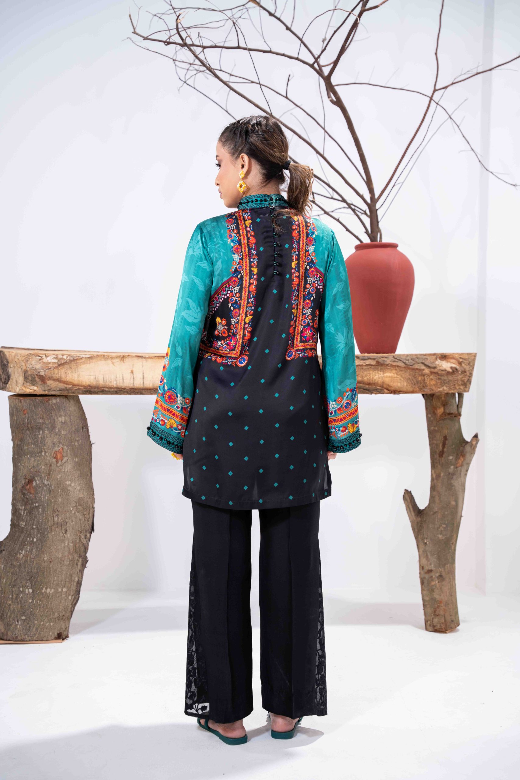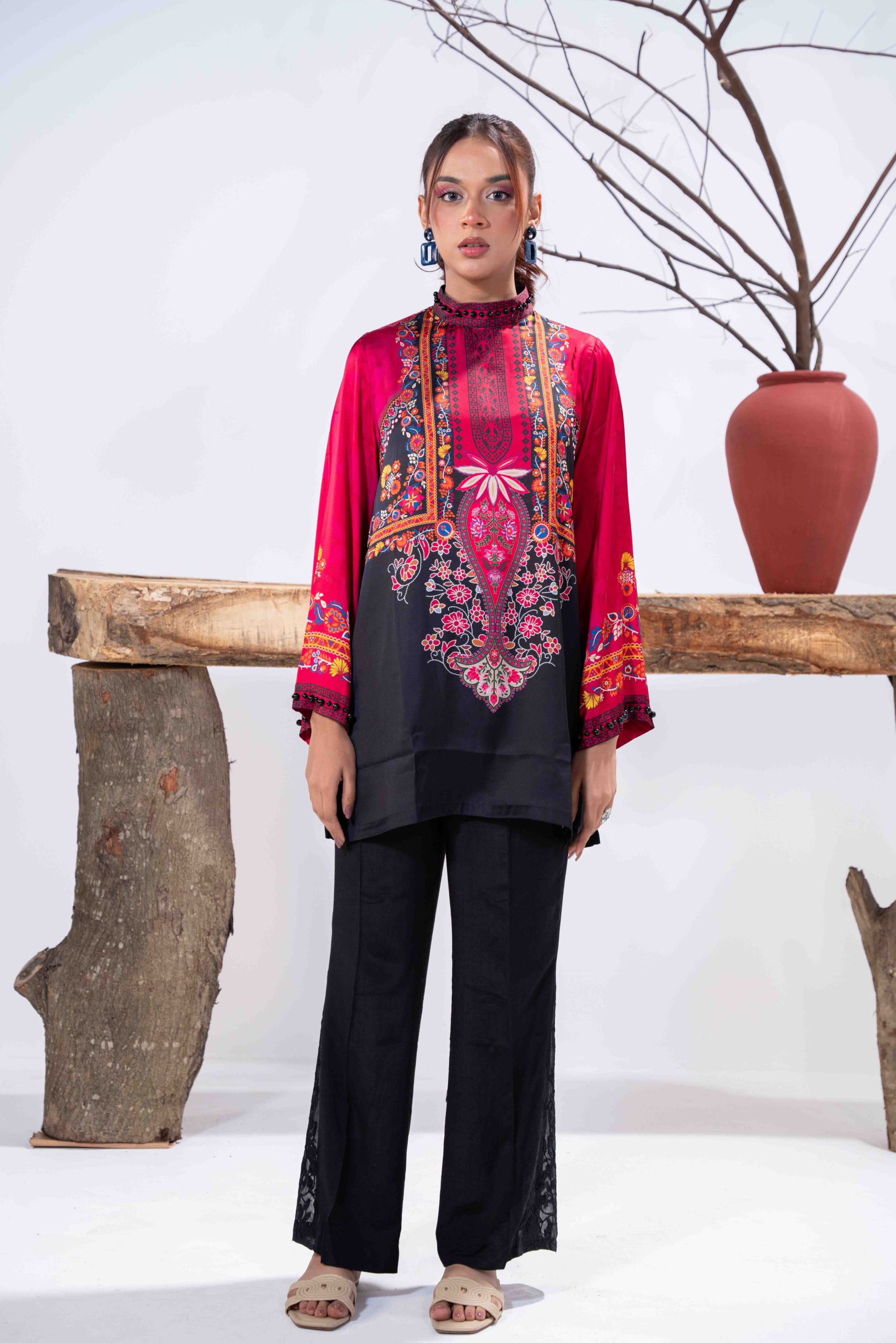 Sublimation Printed Front, Back, high neck ban collar, back slit with pearl details. full straight sleeve with pearl details on hem.