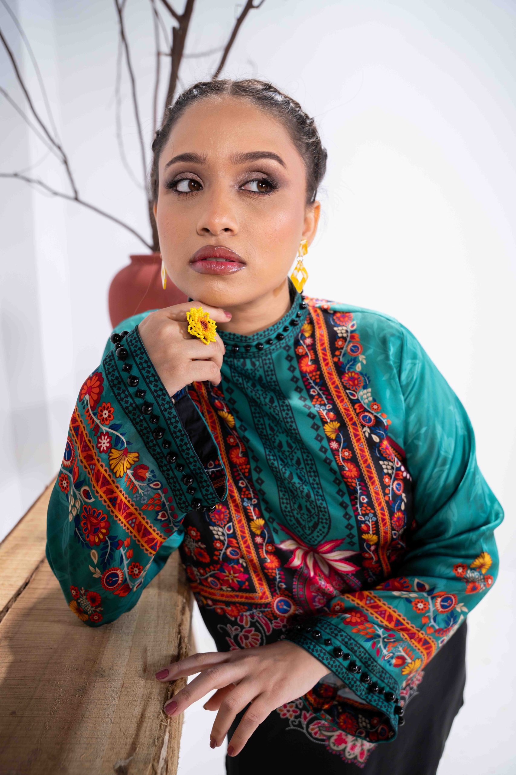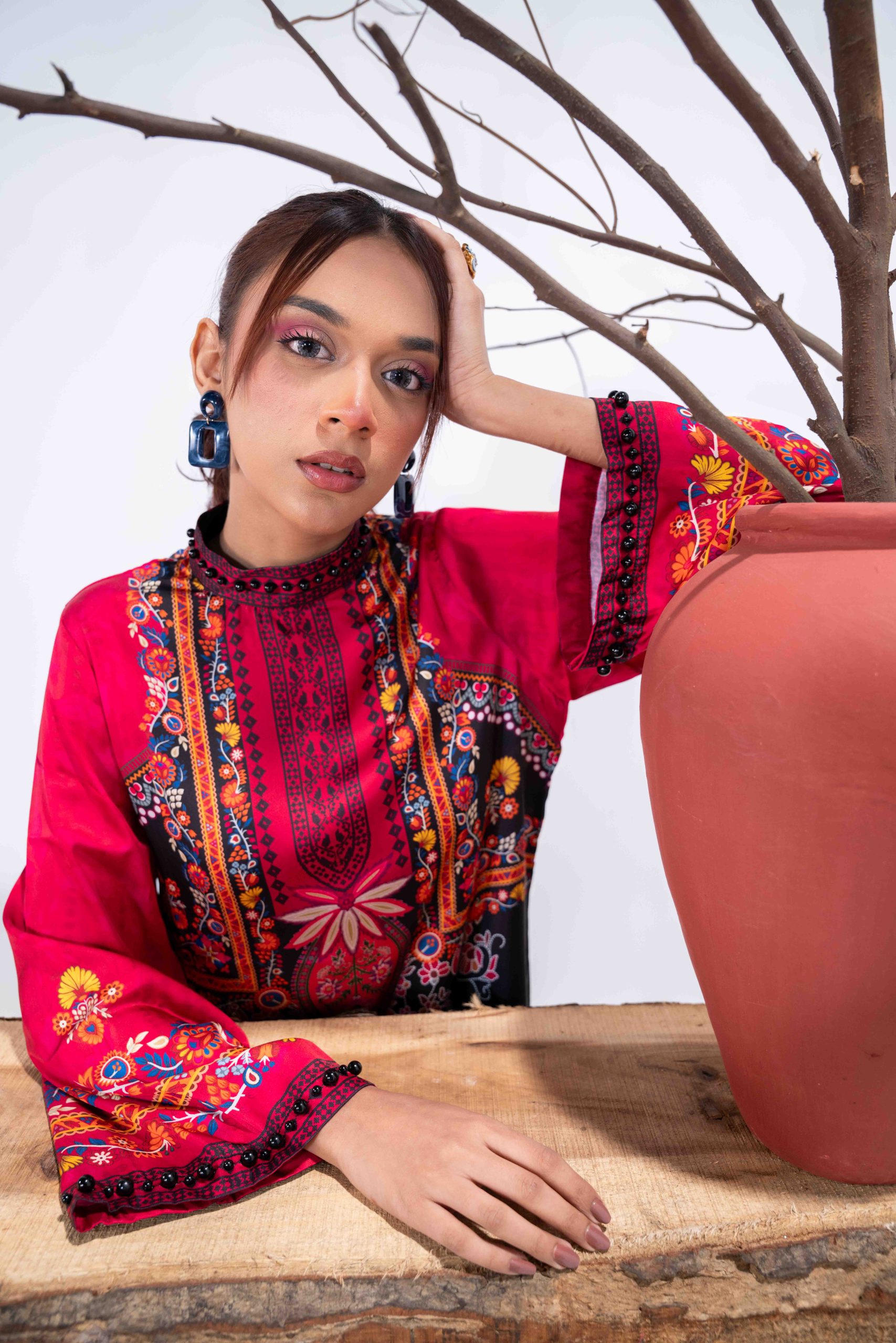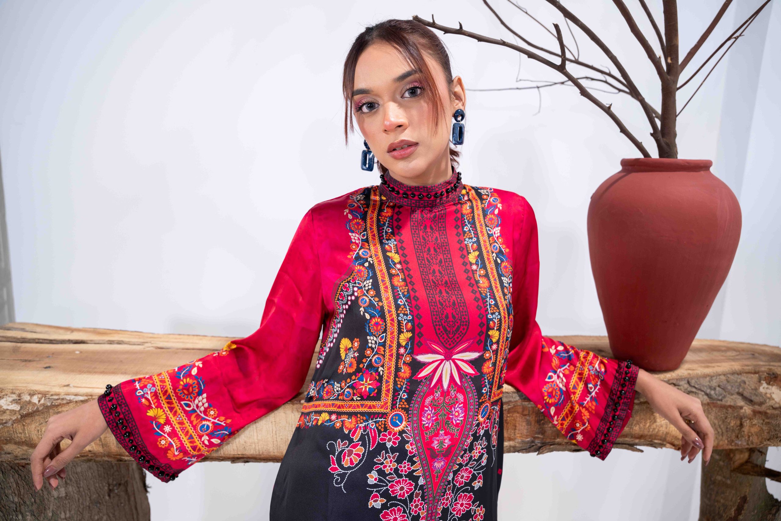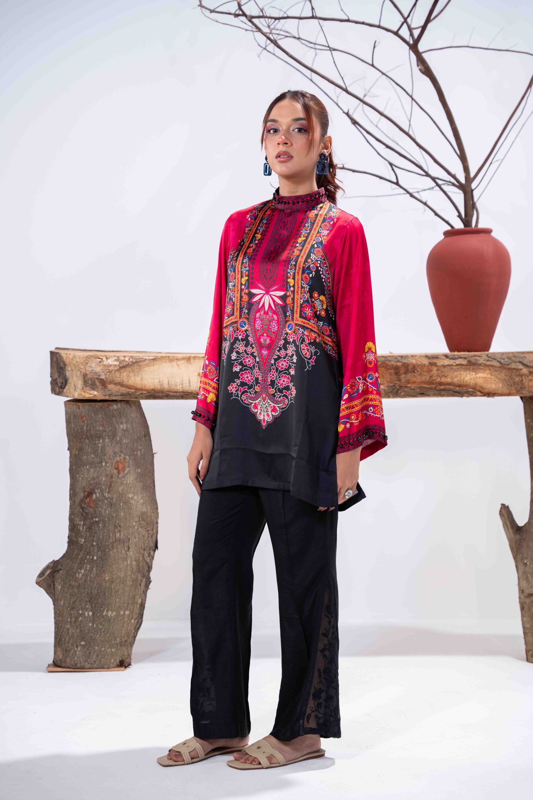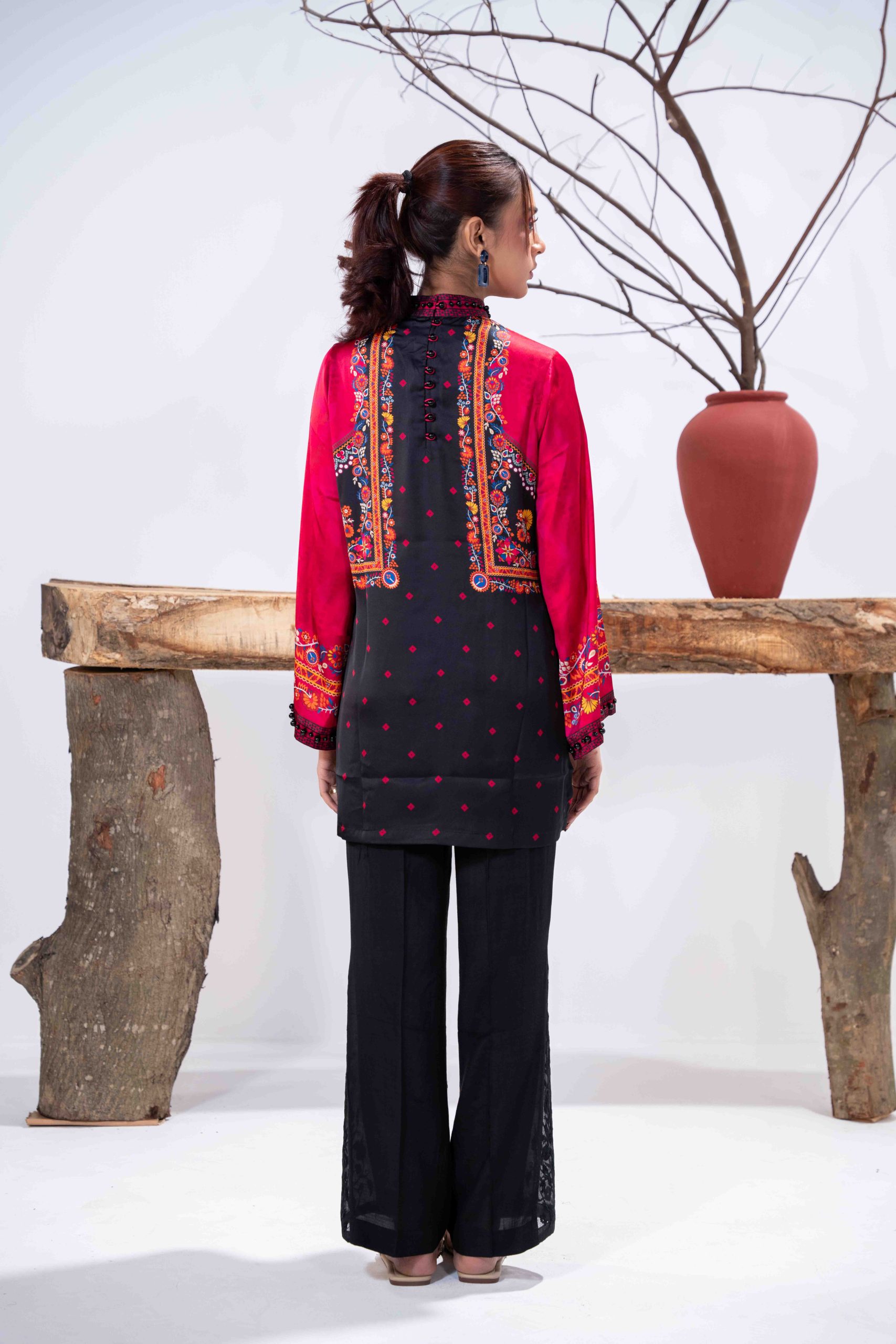 Sublimation Printed Front, Back, high neck ban collar, back slit with pearl details. full straight sleeve with pearl details on hem.