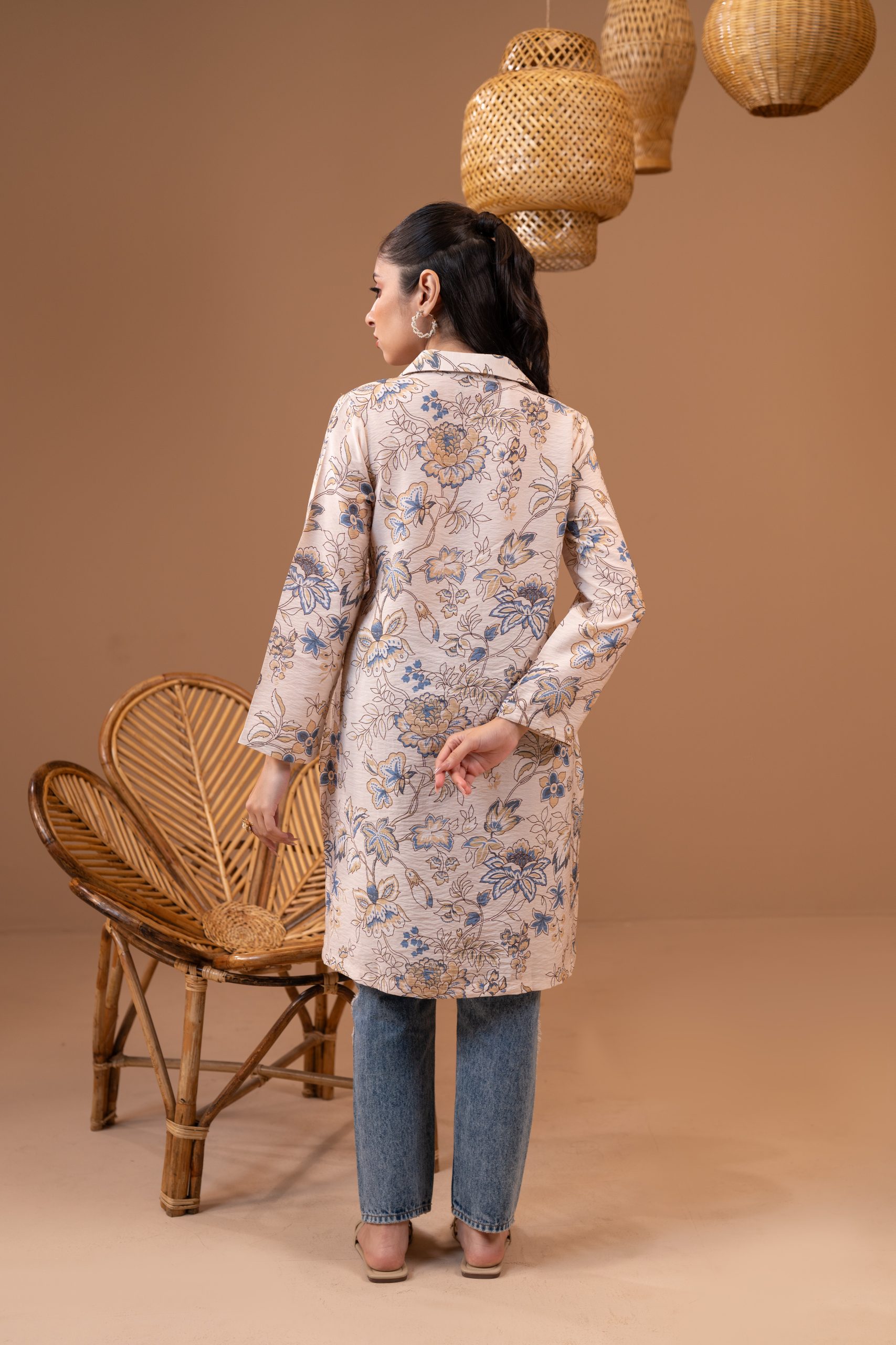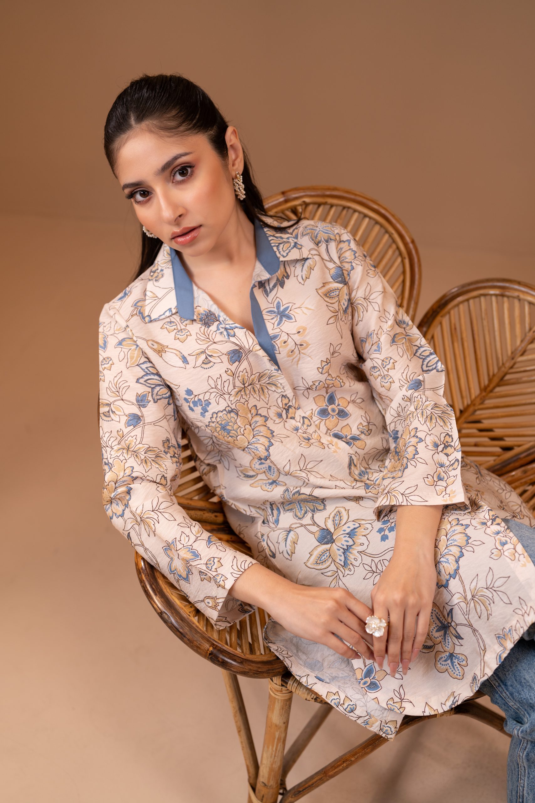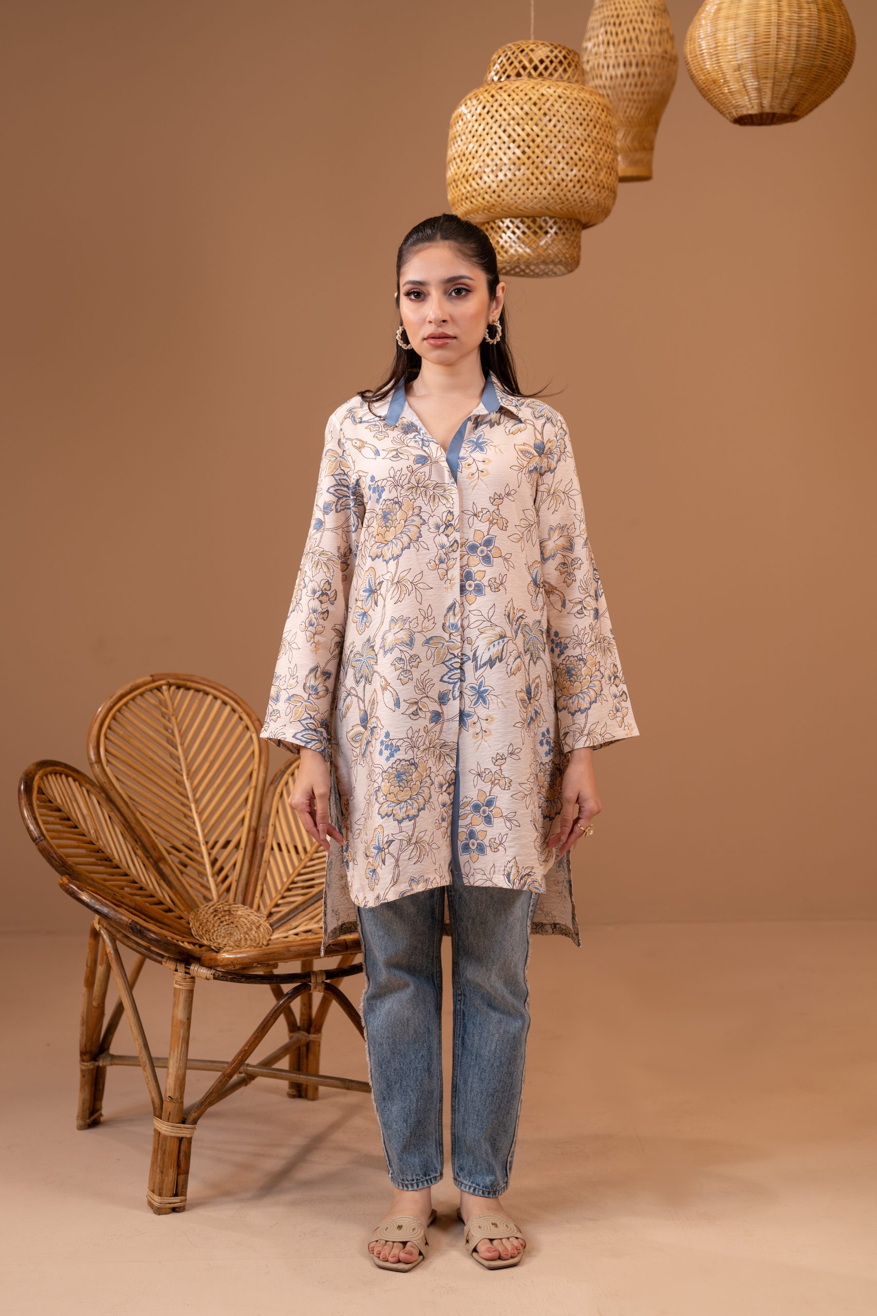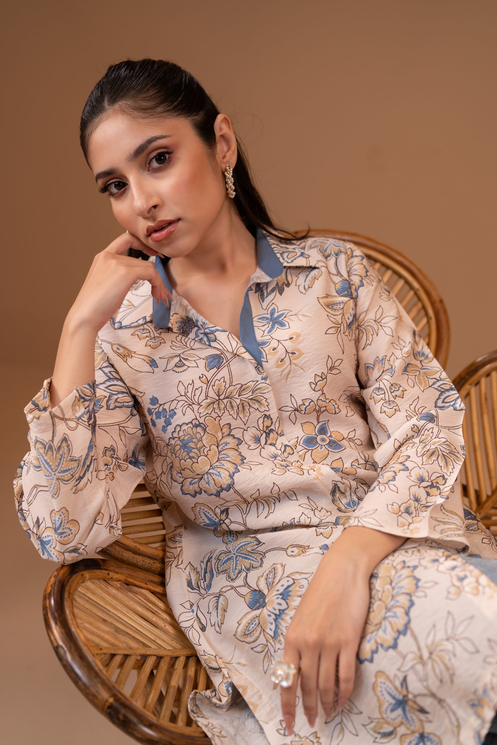 All-over digital print, Shirt collar, contrast fabric with placket, and cut & sew details, full straight sleeve.