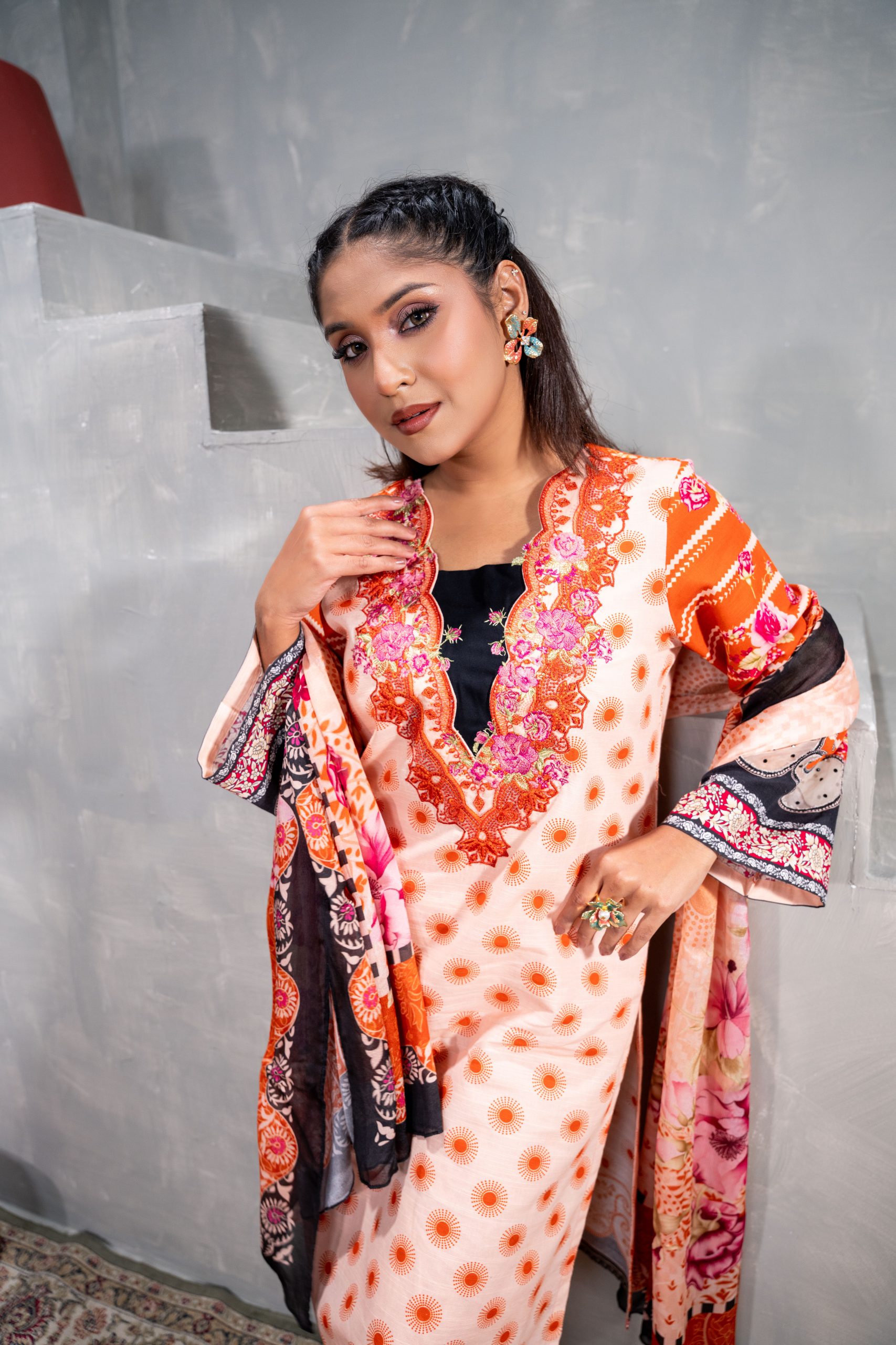Orna: Chinon Chiffon, Digital Print, Pearl details on border.