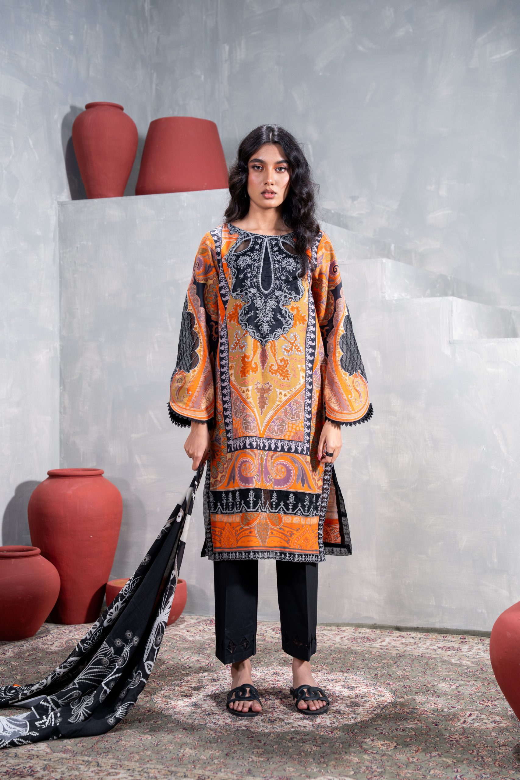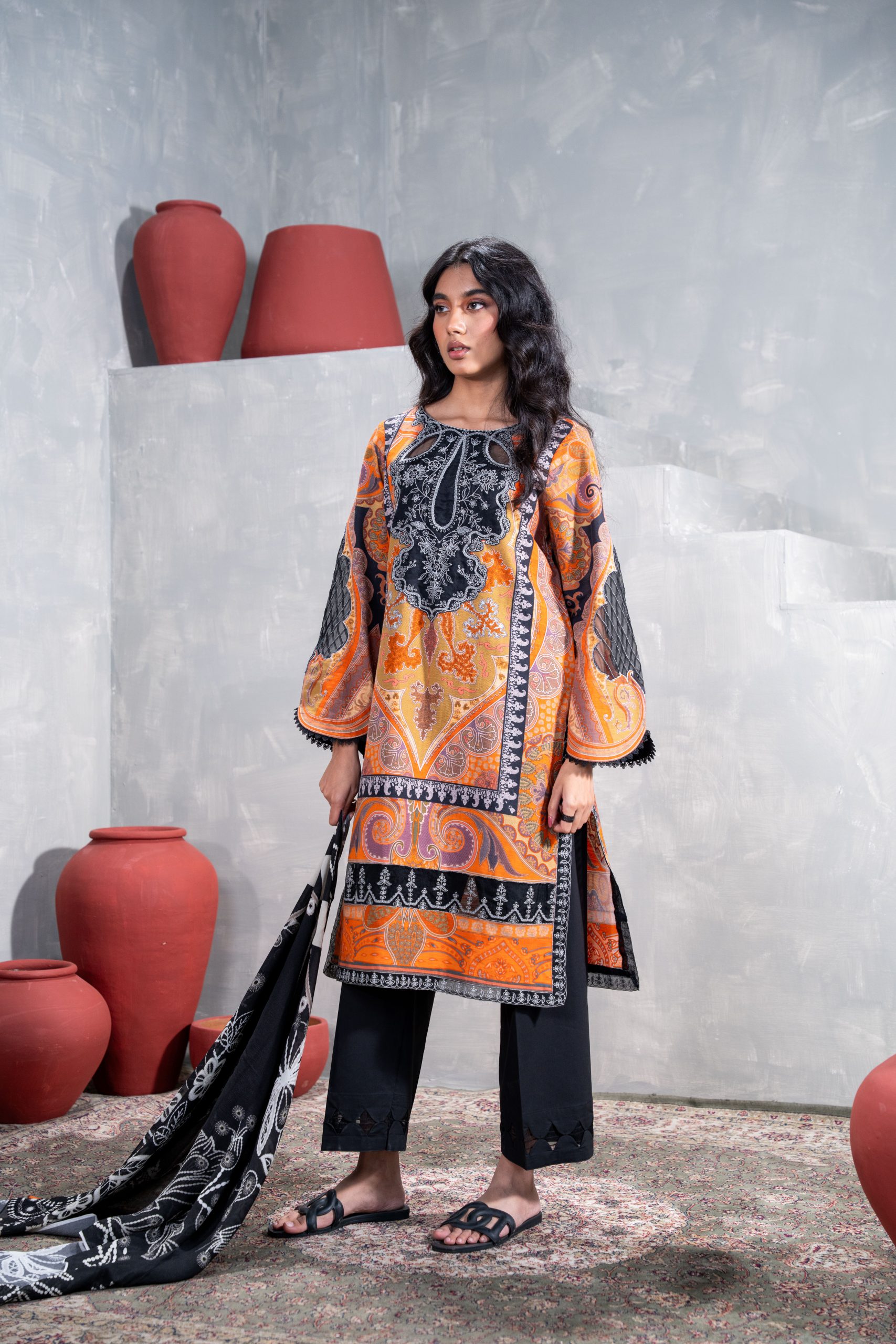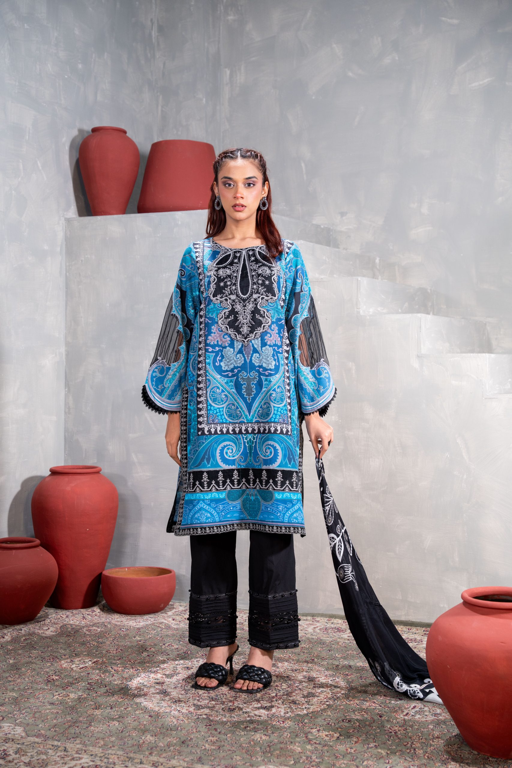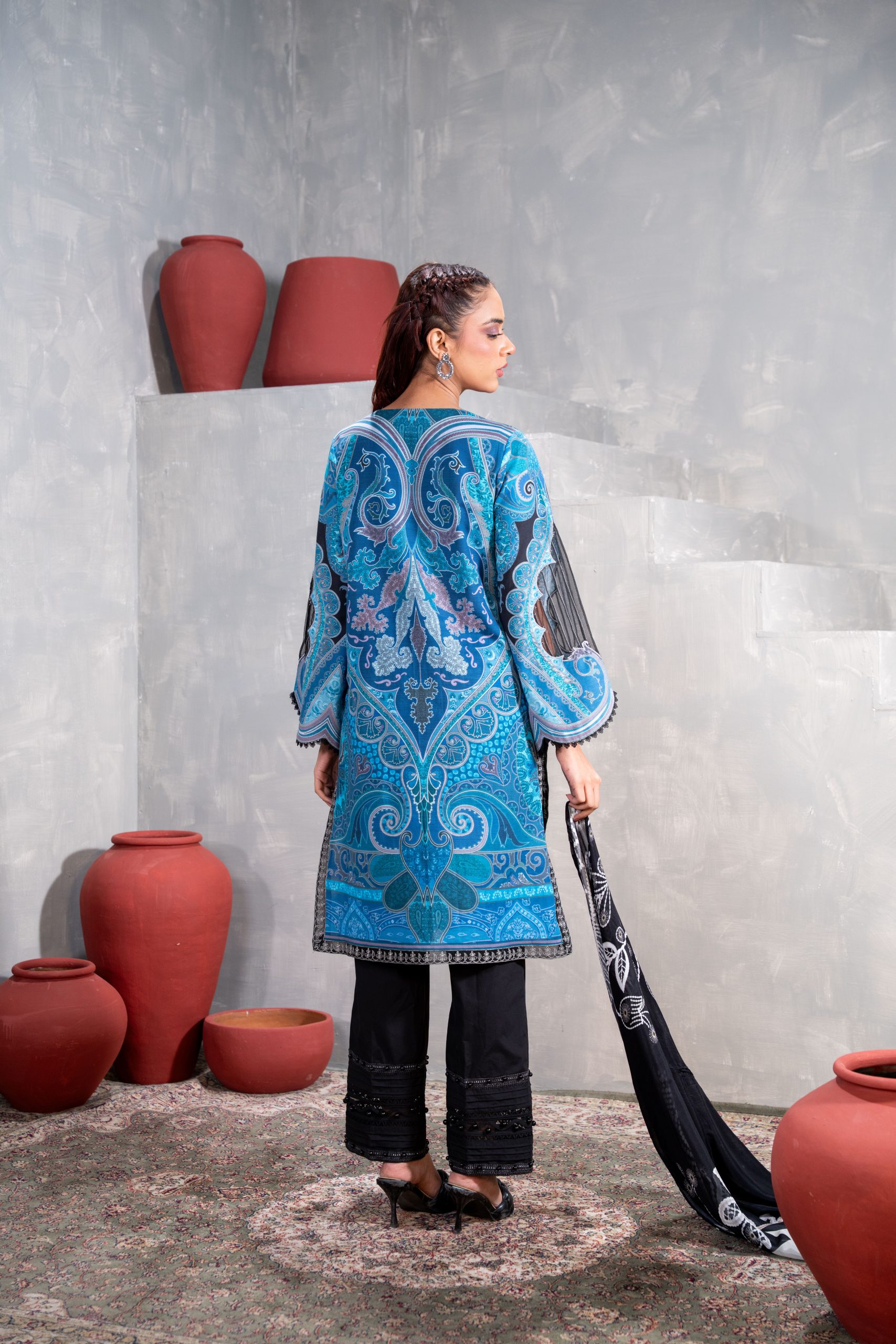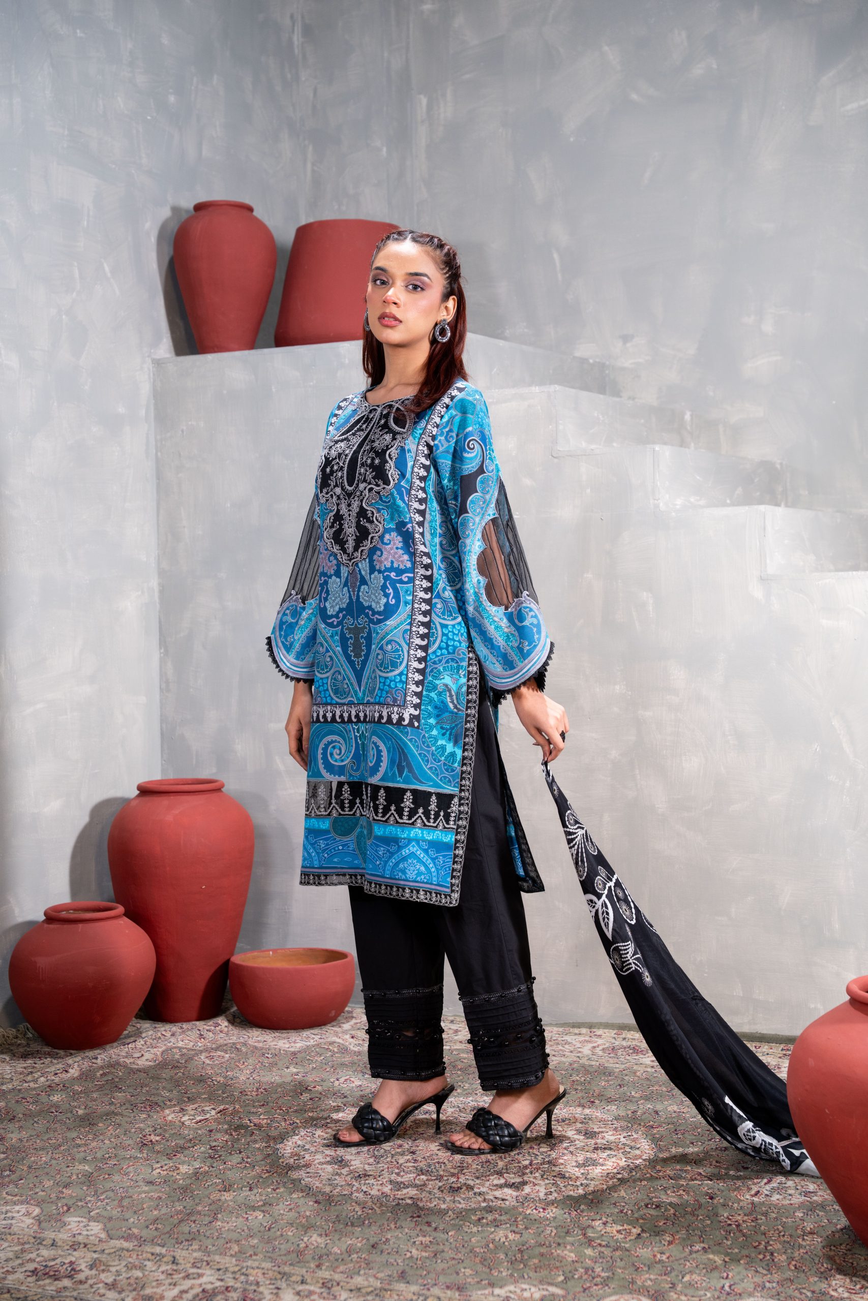 Kameez: 100% Cotton Dobby comes with all-over digital print, Round neckline with nice fabric cut design, organza and embroidery details. straight sleeve with organza, pin tuck details, and lace details on sleeve hem.