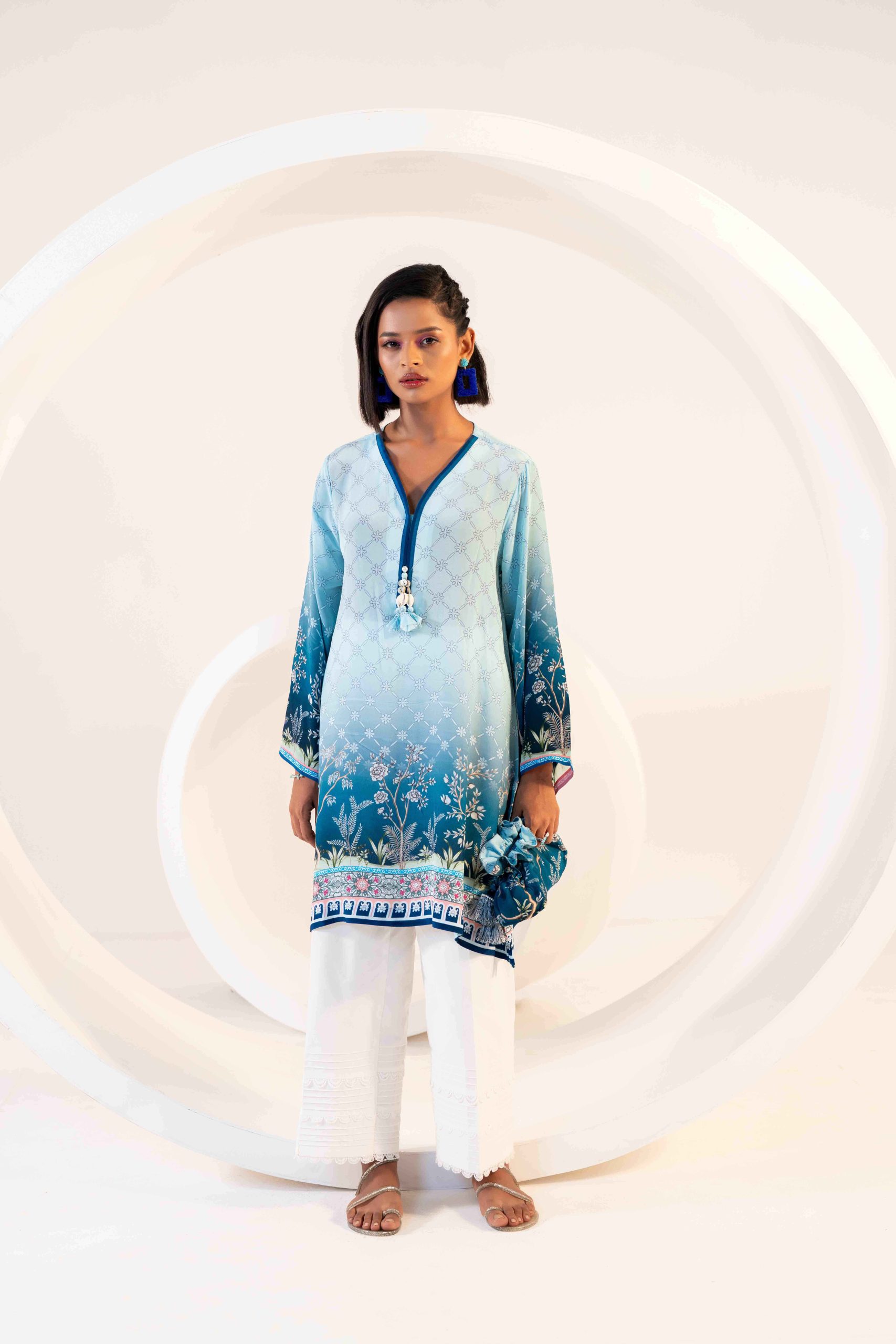 The Nabina is designed for effortless elegance, featuring a fully digital printed front and back, complemented by a stylish Y-shaped neckline with tassel embellishments. The full straight sleeves are accented with delicate bead details, bringing a refined finish to your look.