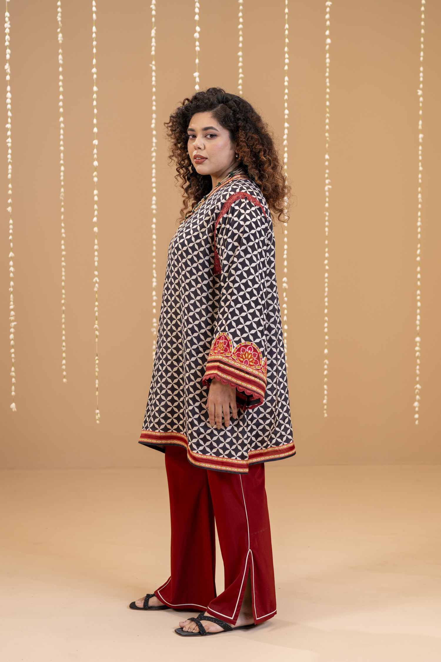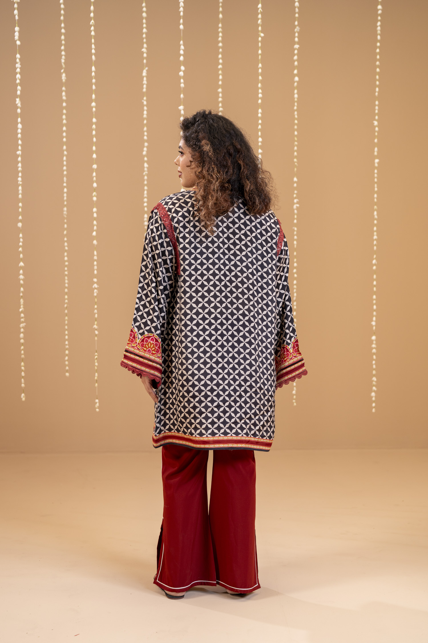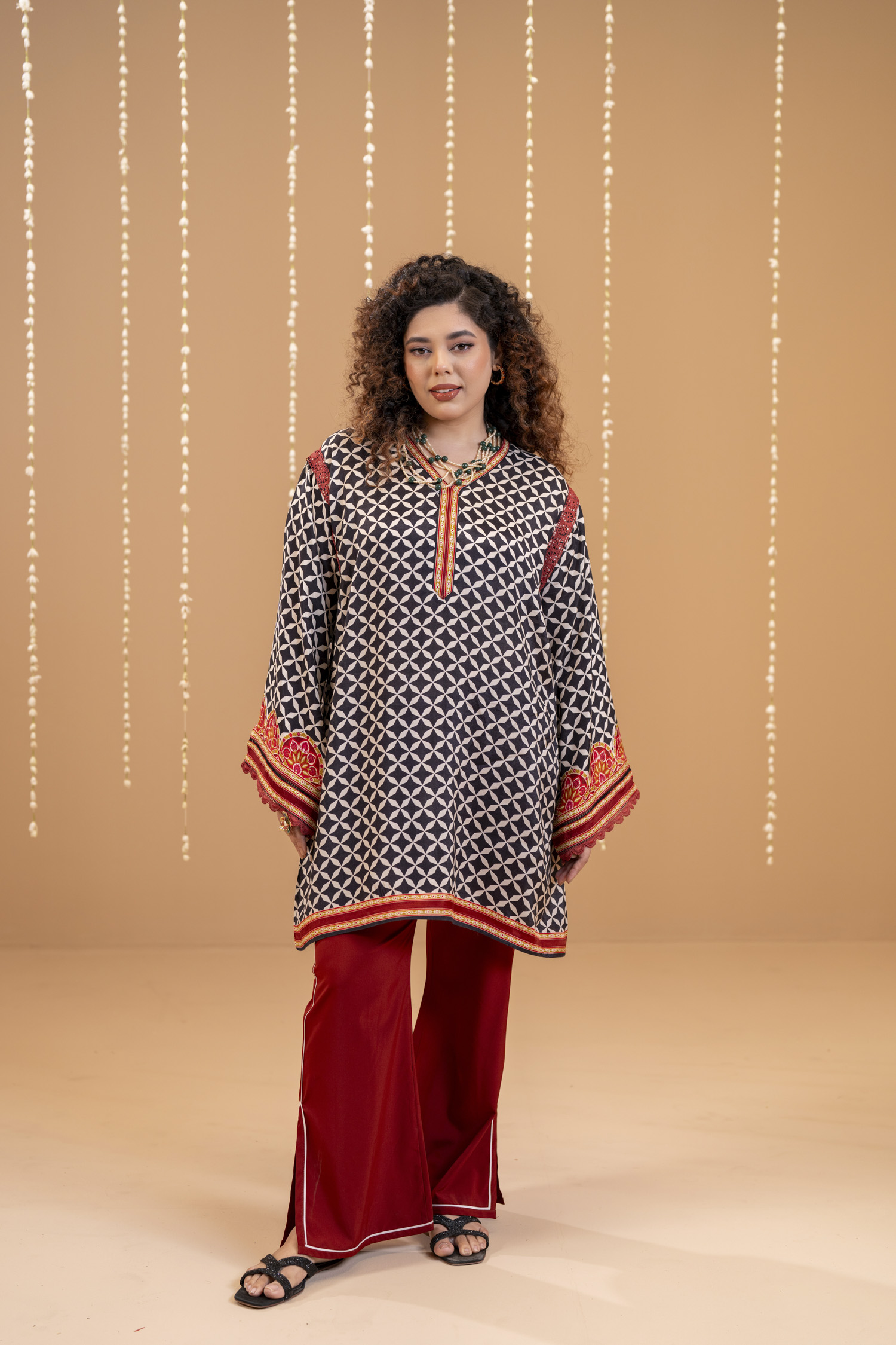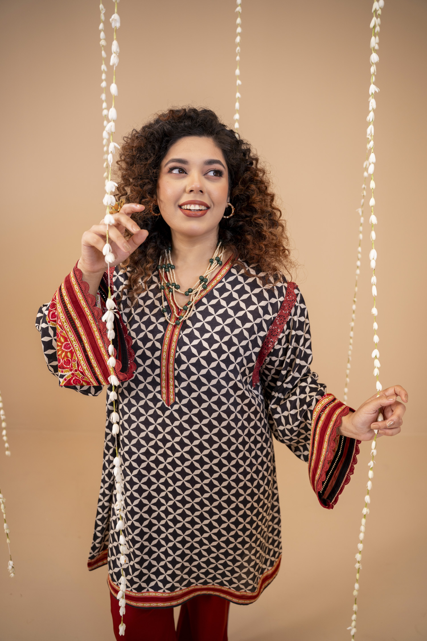 100% Viscose comes with all over digitakl print, full straight sleeve, lace details on arm whole and sleeve hem.