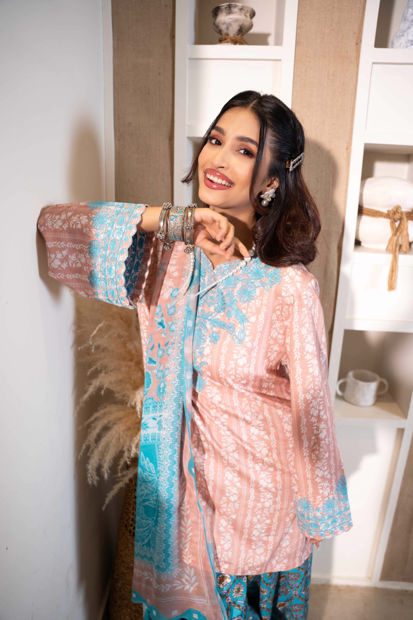 The kameez has a round neckline with lovely embroidery details. It has straight sleeves and lace on the side slits. The trouser is also cotton dobby with a digital print.