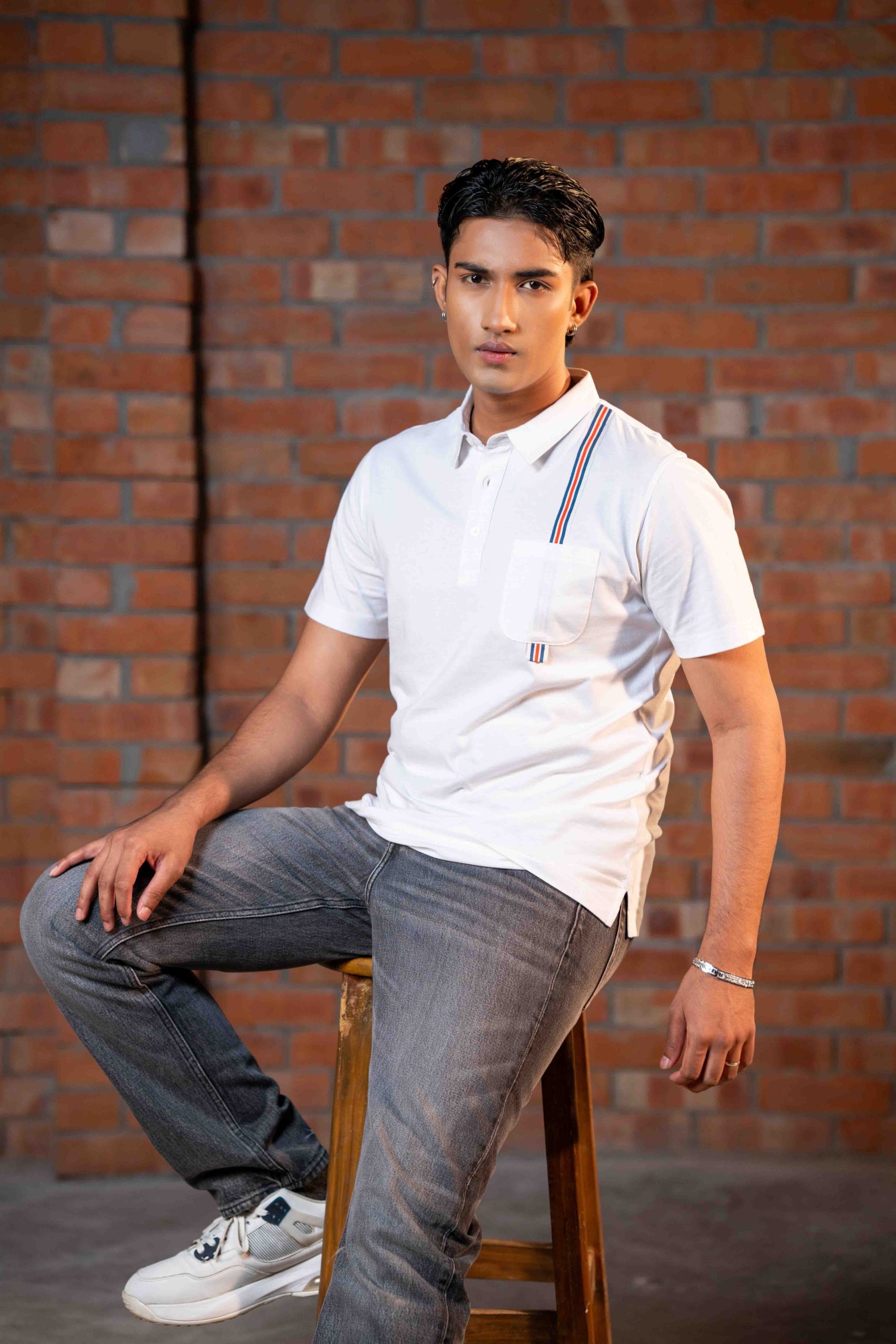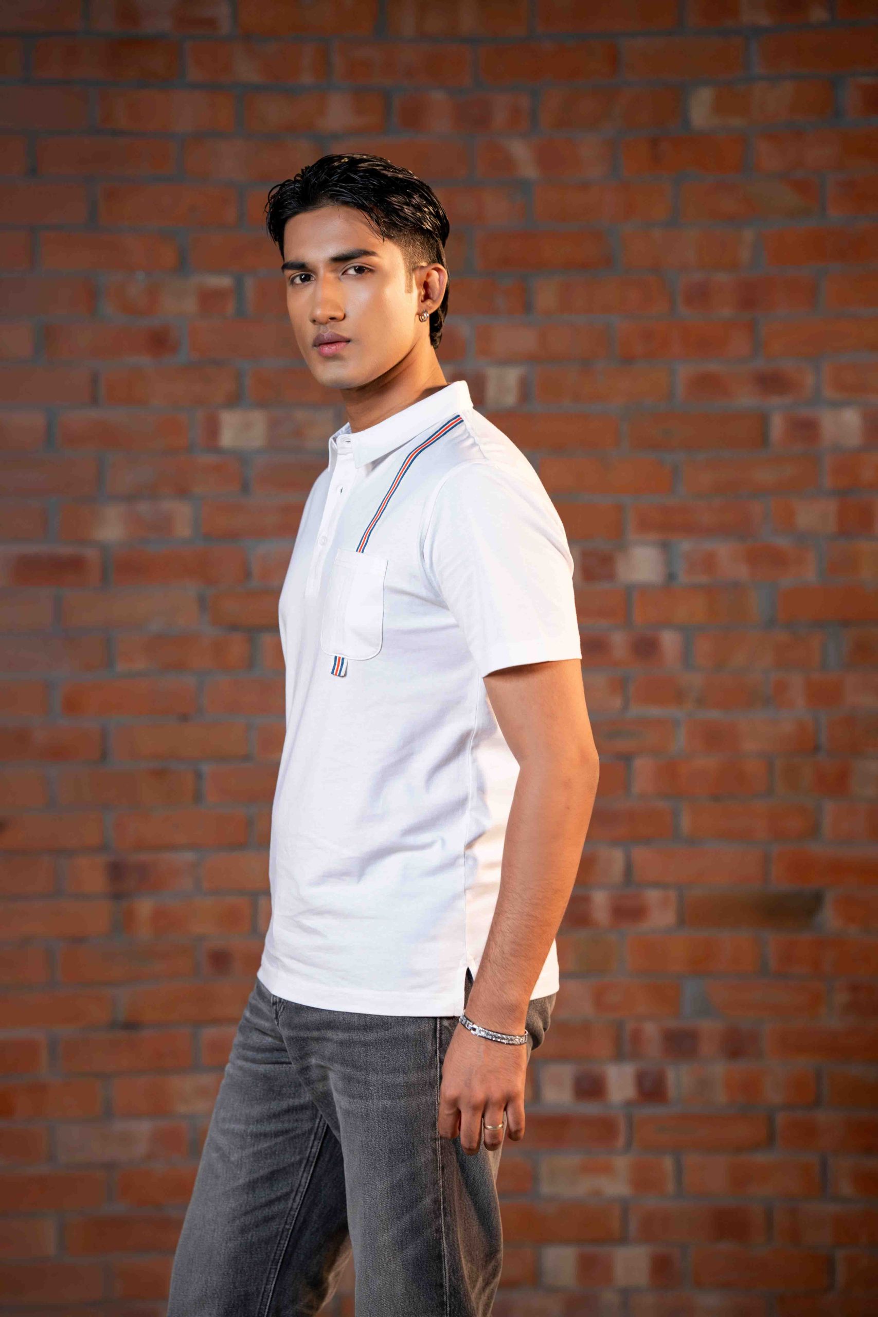 Collar with placket, chest pocket with twill tape details, short sleeve.