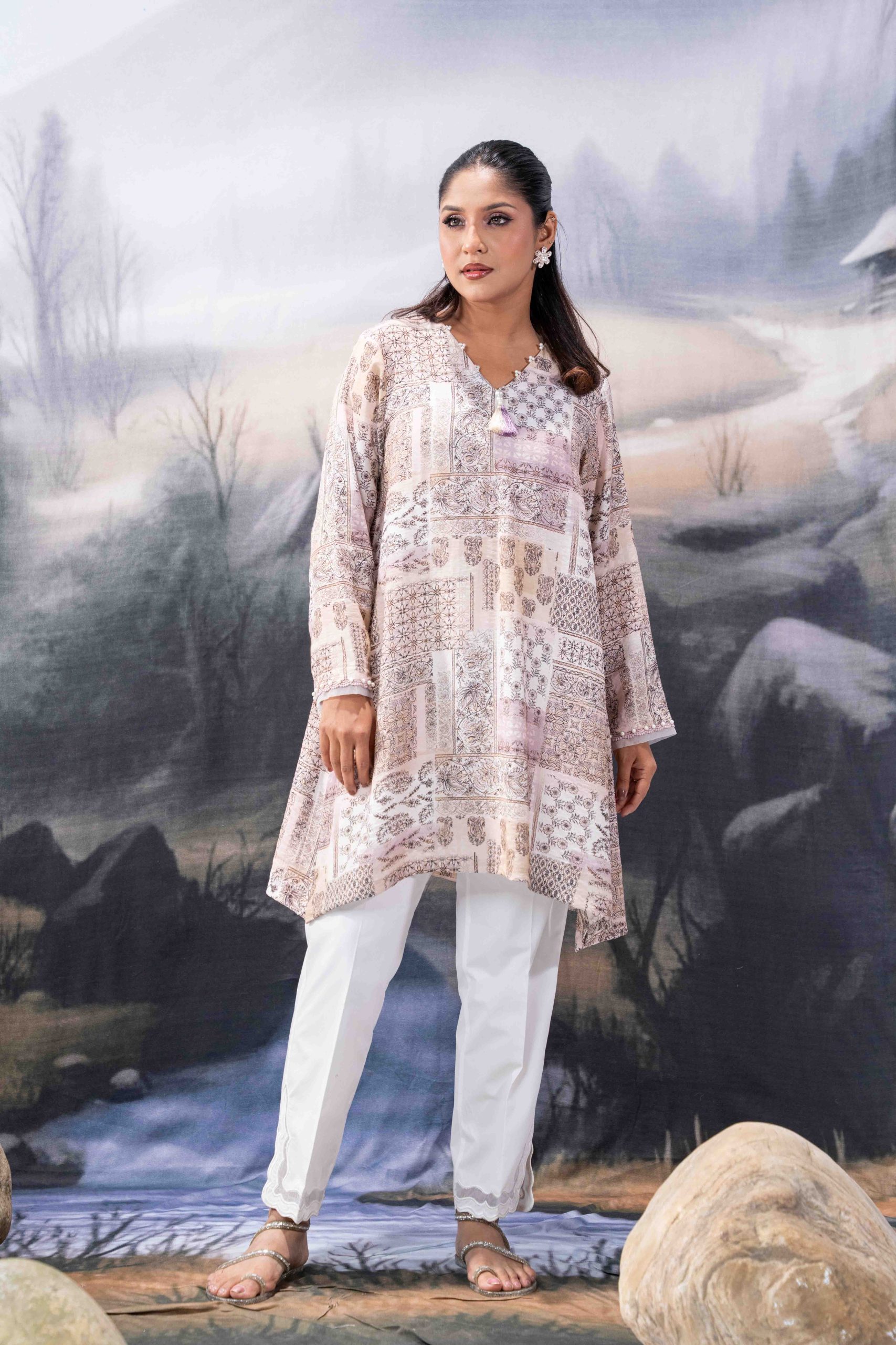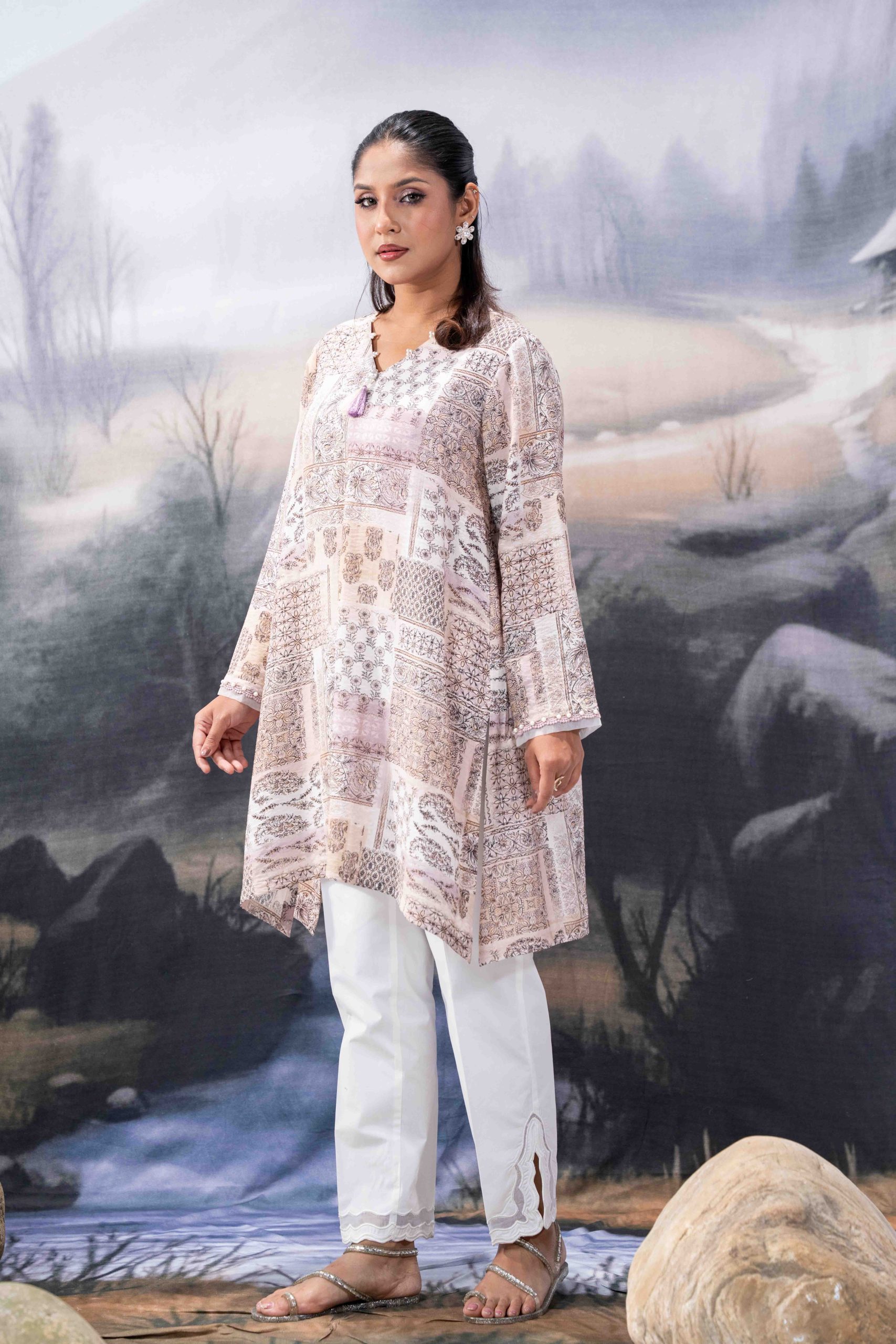 Rupanita is a stitched 1 PC kurti with all-over digital print and V-neckline details. Fabric: 85% Rayon 15% Nylon.
