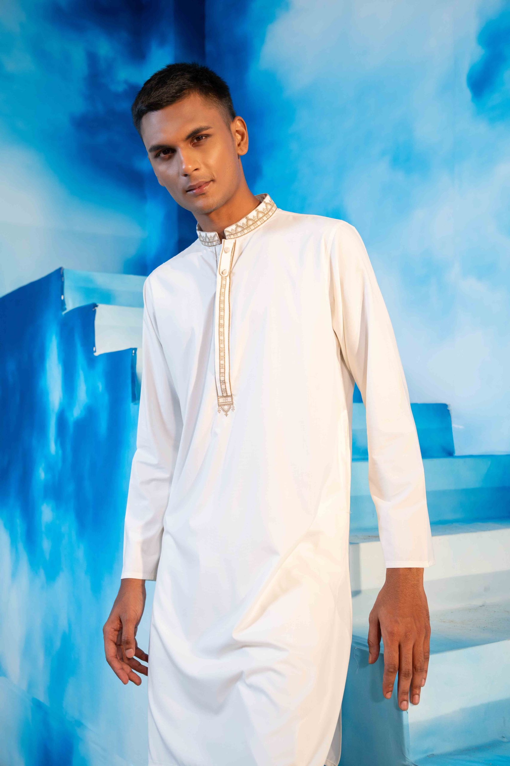 Embrodried Coller with hidden placket, show button, narrow sleeve.