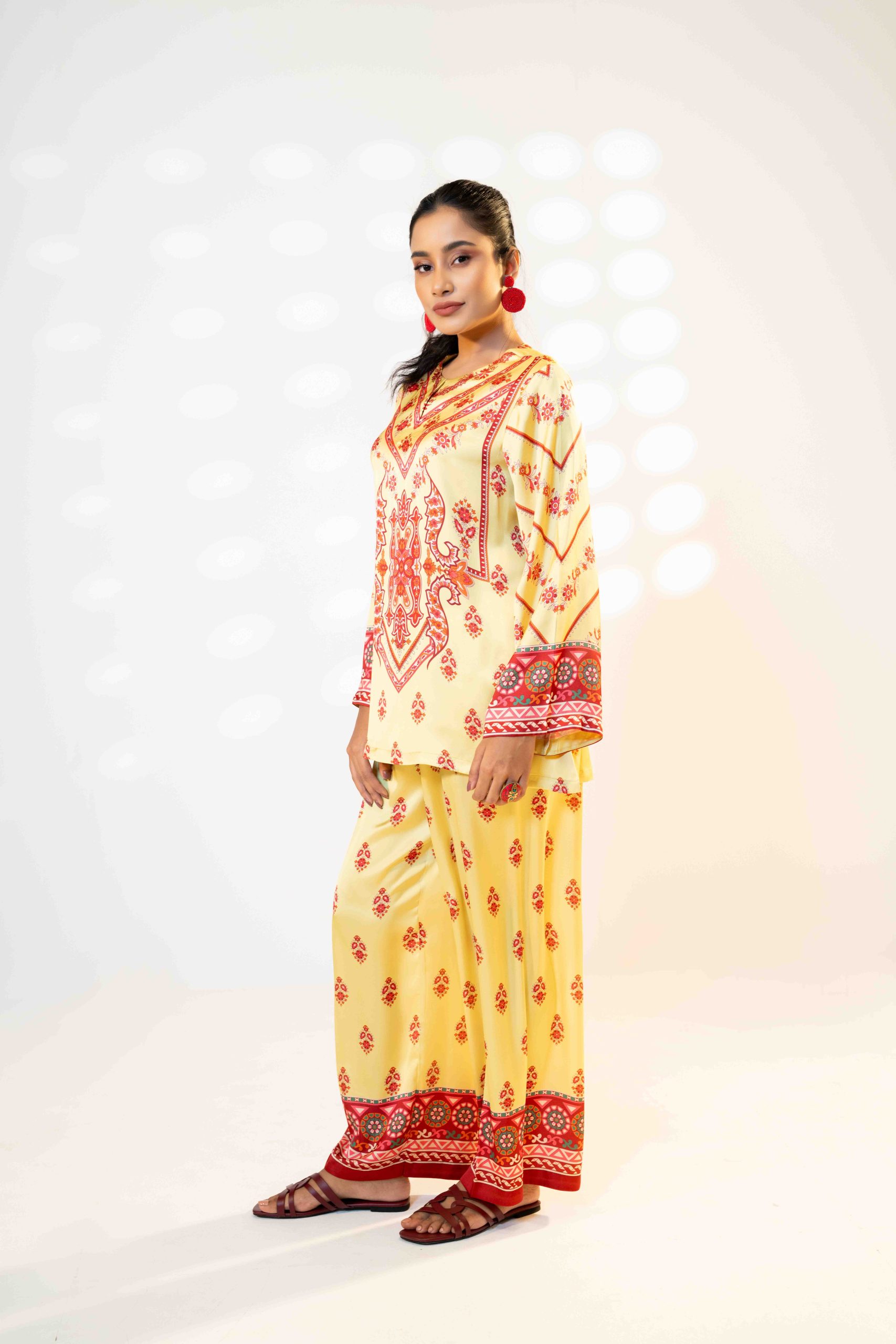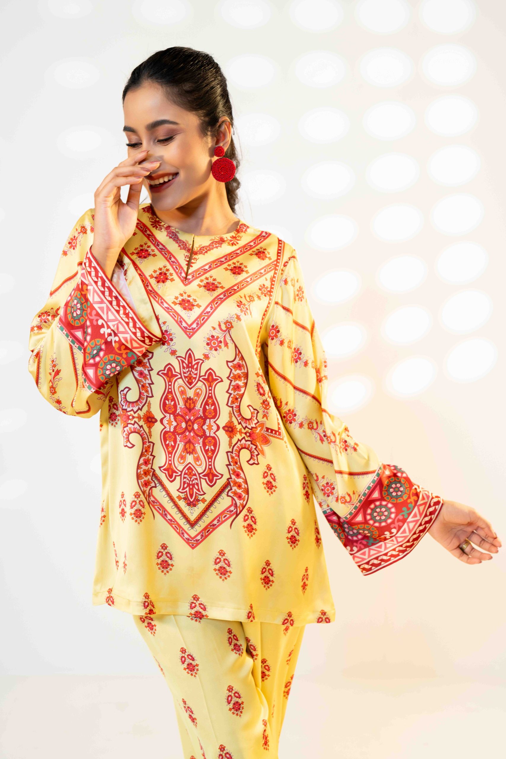 Kameez: 100% Polyester satin comes with all-over sublimation print, round neckline with keyhole details, straight sleeve.