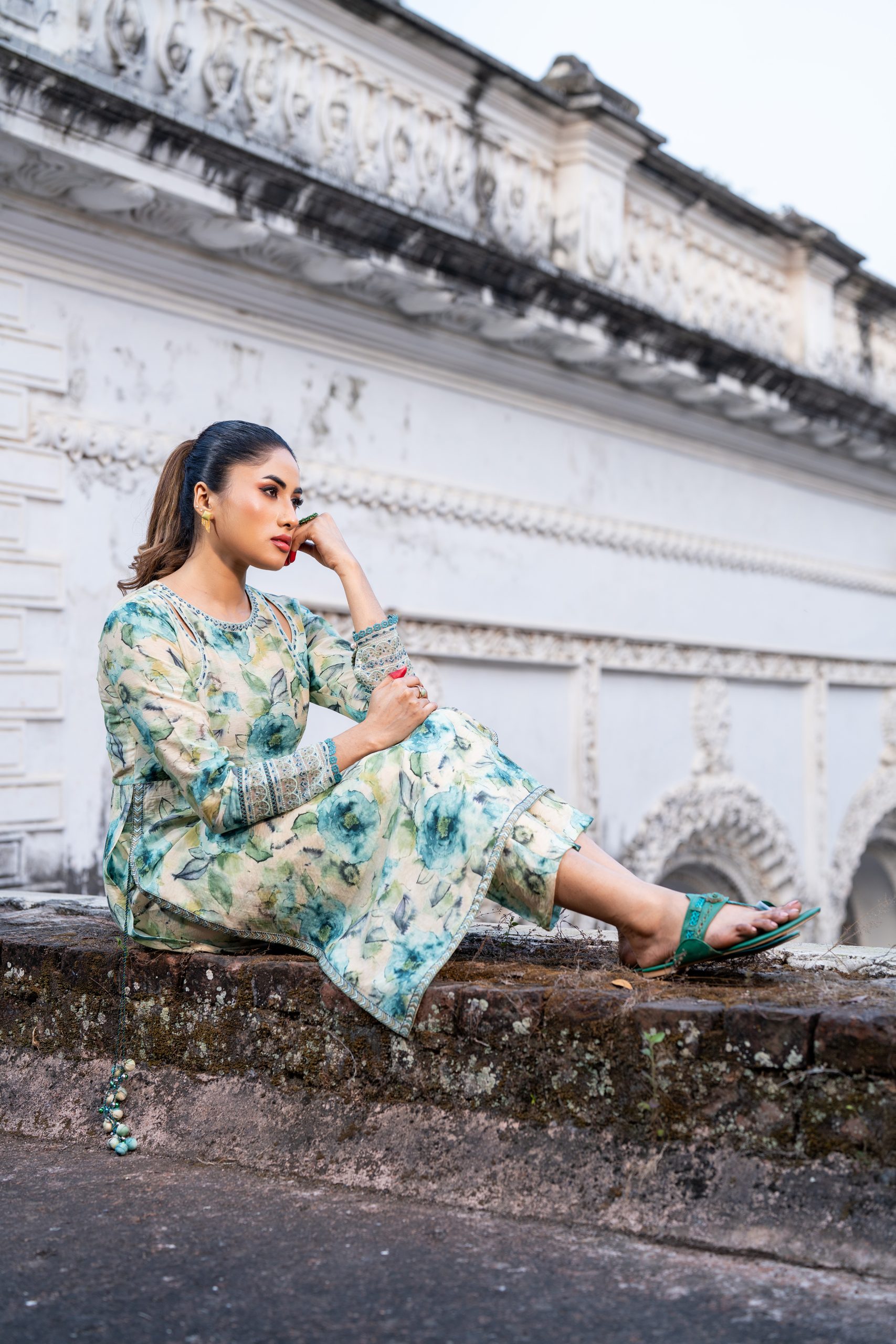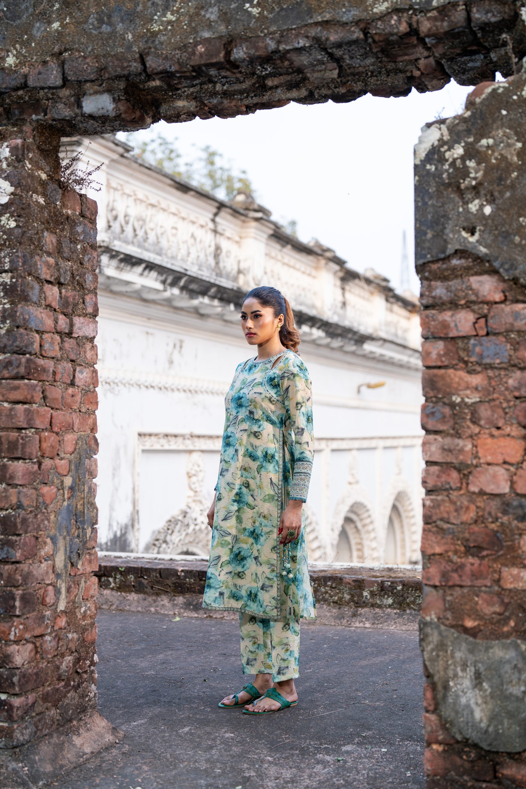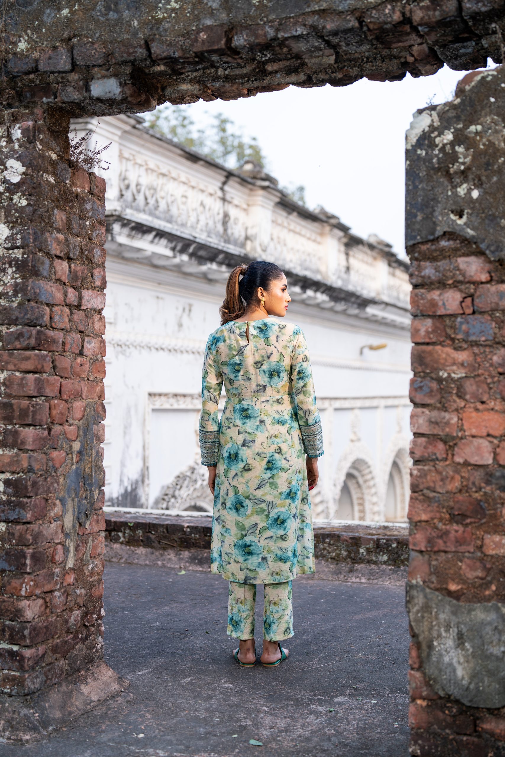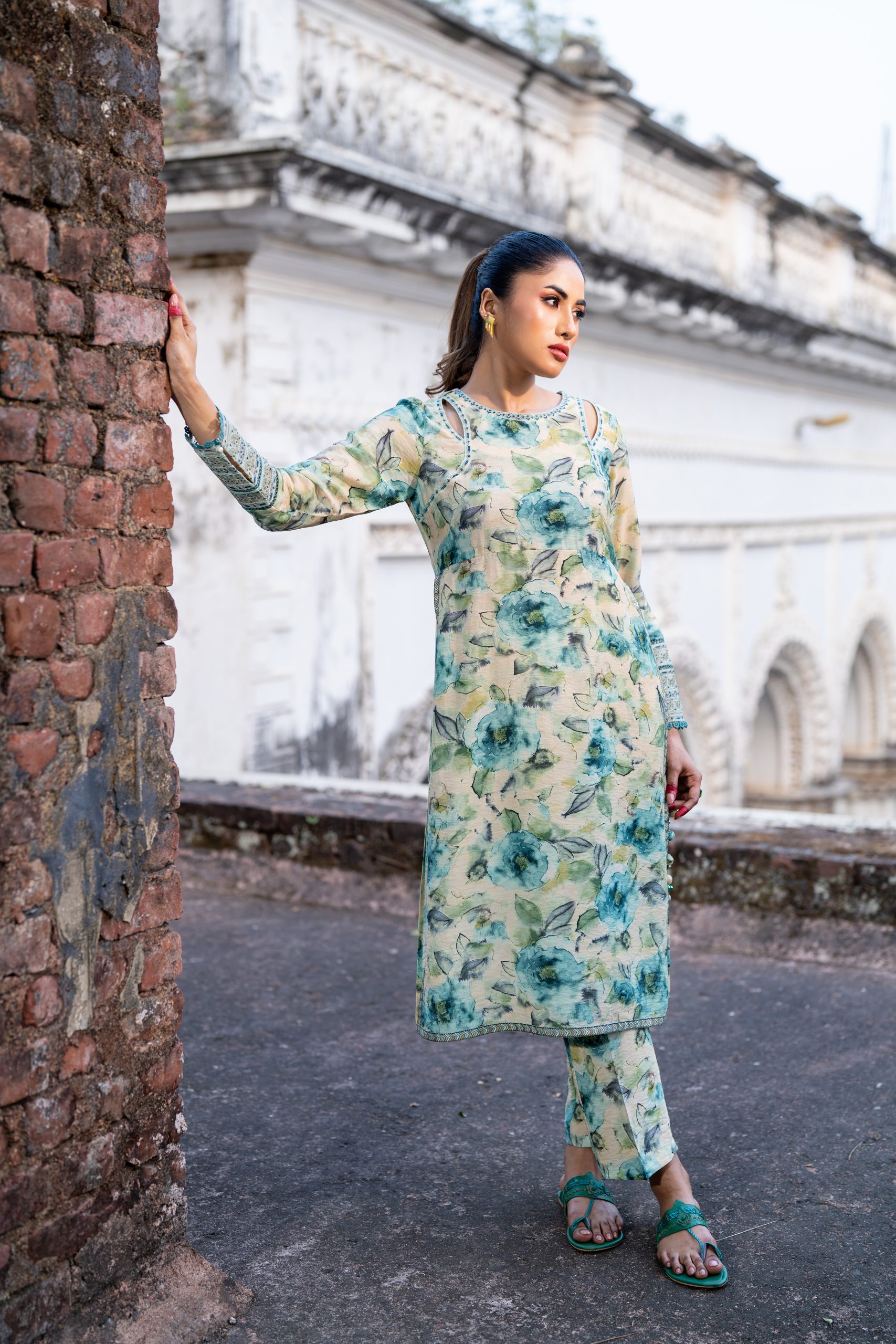 Digital Printed Front, back, Short round neckline embroidery and organza details, join lace, Embroidered, Lace and Organza details straight sleeve.