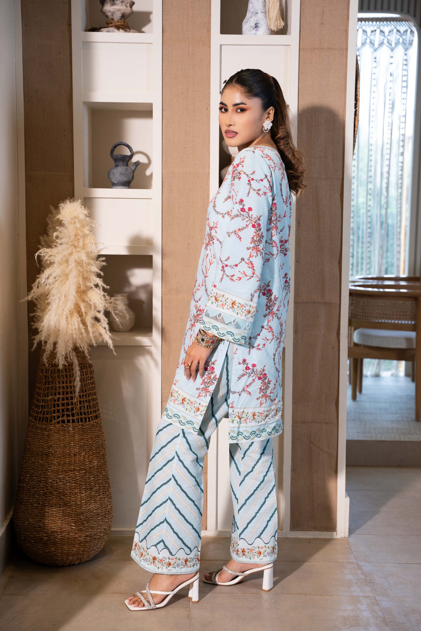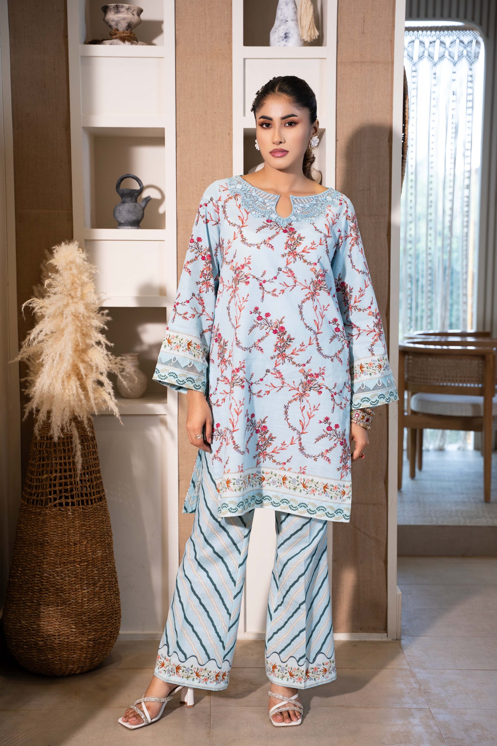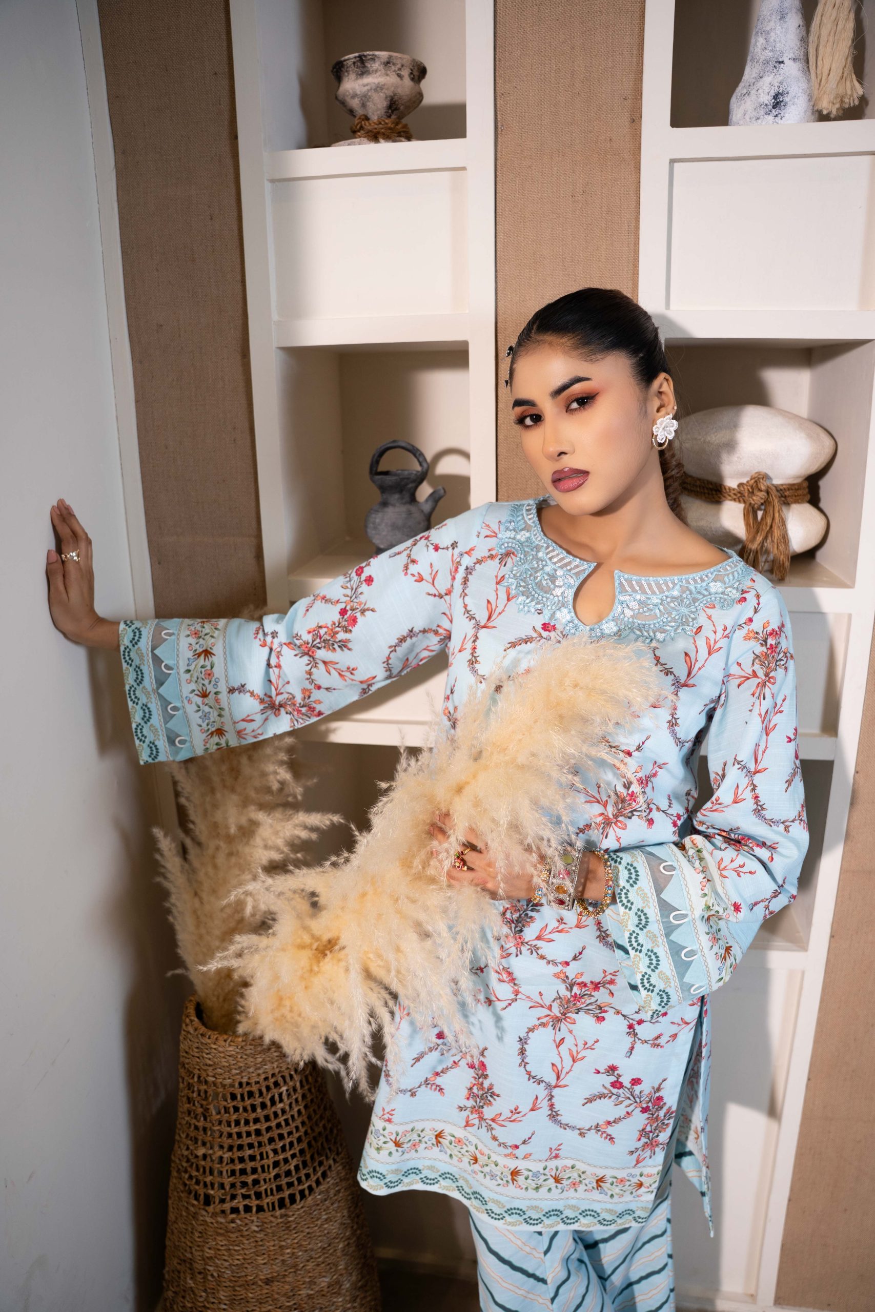 This set features a lovely digital print with organza. It is made from 100% cotton khaddar fabric. The neck and sleeves have fine embroidery work. It comes in a nice sky blue color.