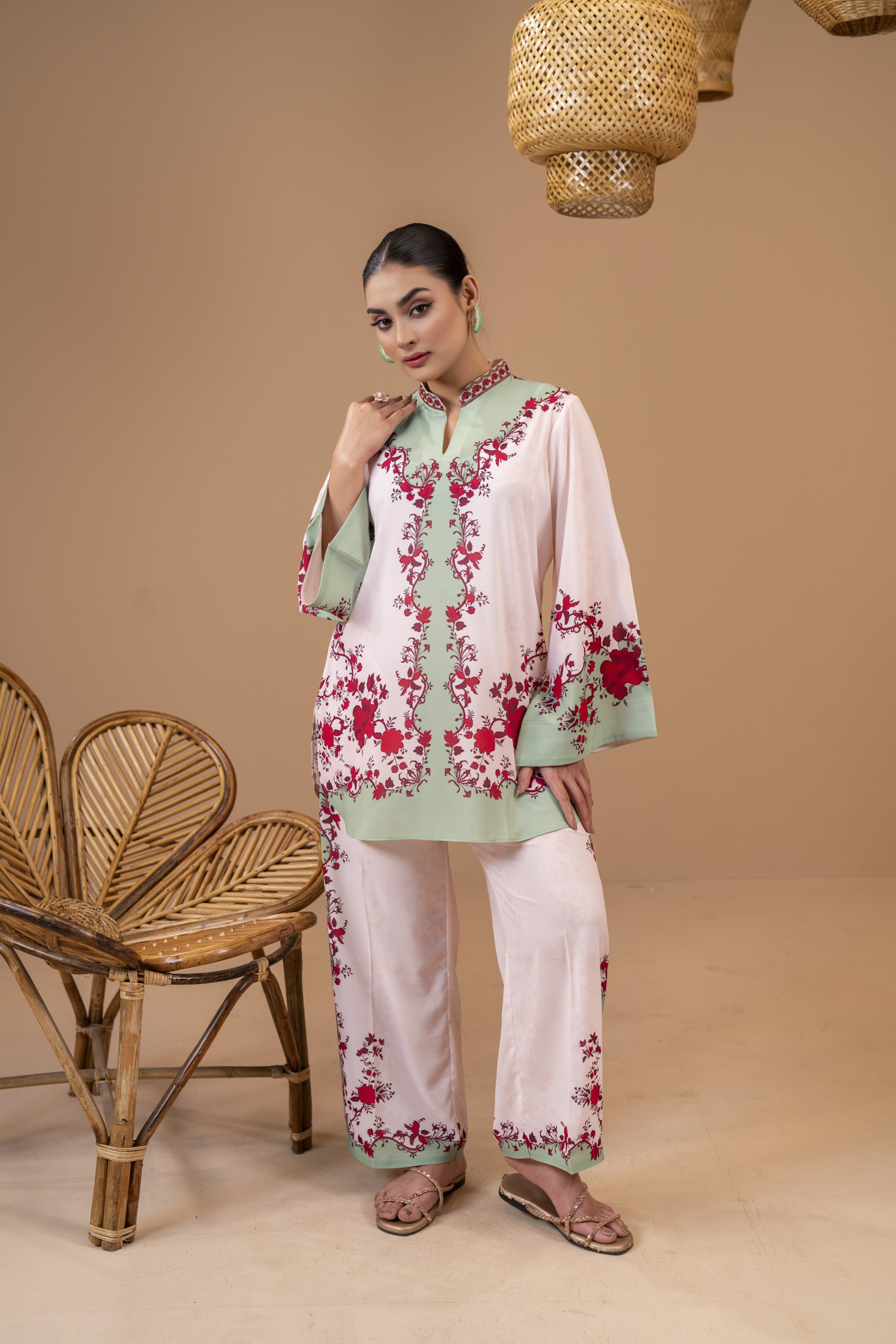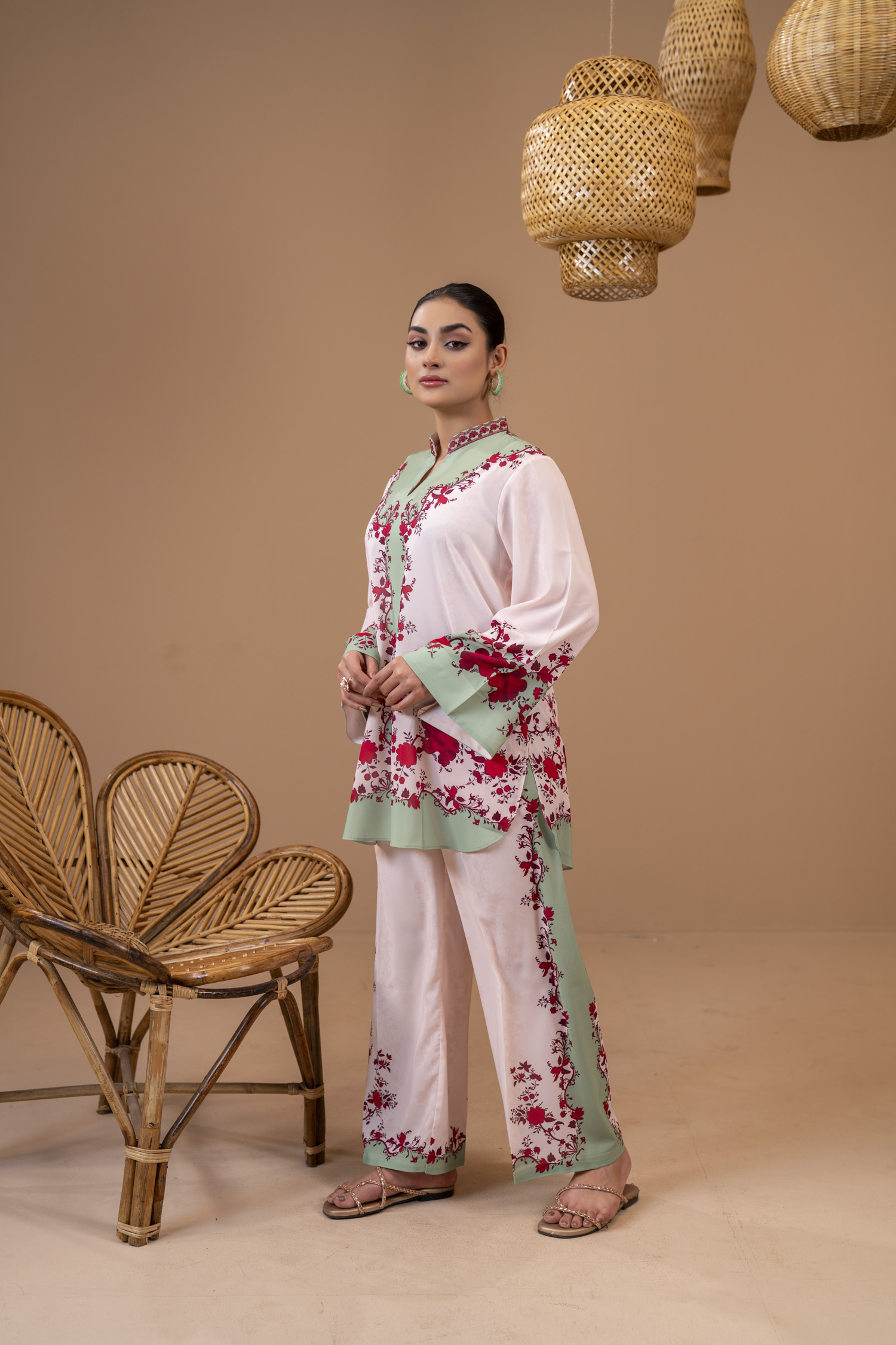 Kameez: 100% Polyester Georgette comes with all-over sublimation print, Bann collar with embroidery details, V shape neckline, full straight sleeve